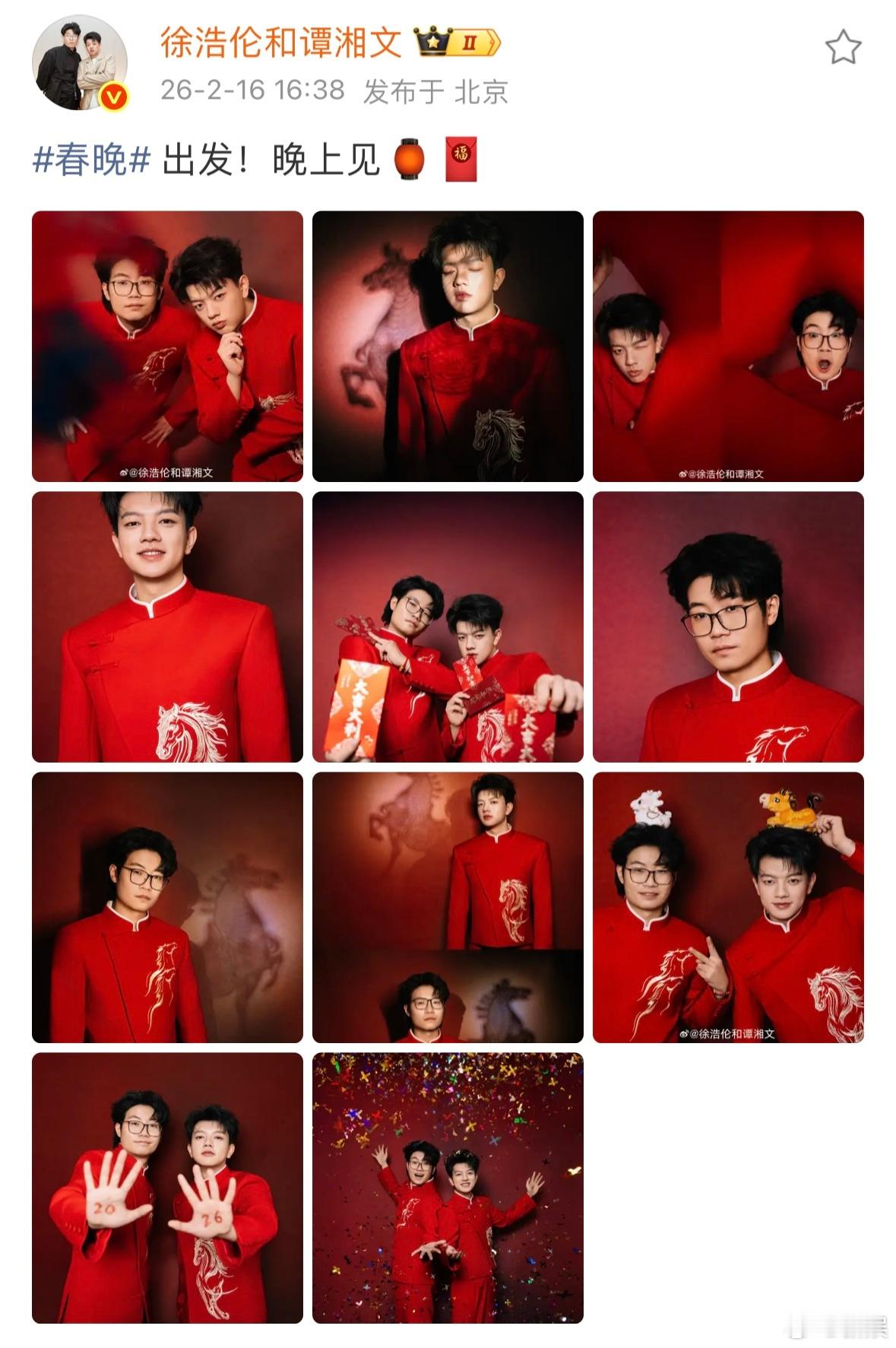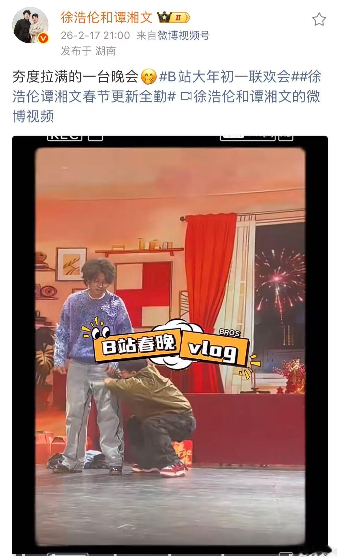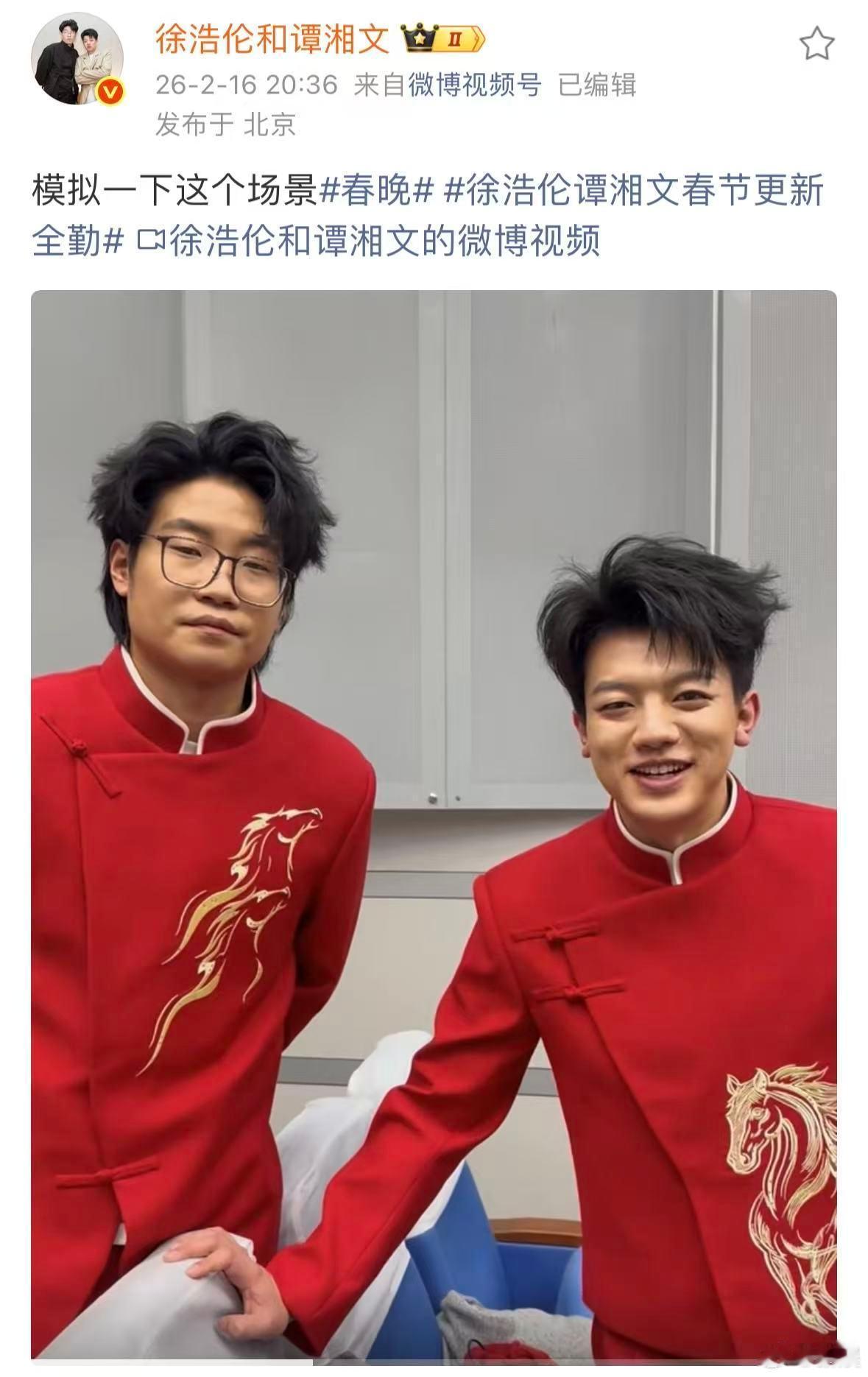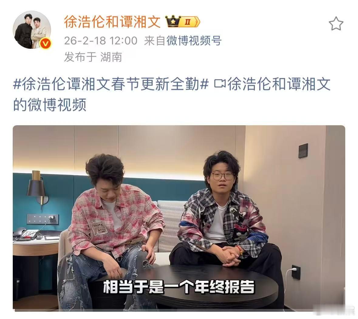 徐浩伦谭湘文春节好忙啊 这个春节劳模我投徐浩伦谭湘文一票!除了央视湖南B站三台春晚,哥俩自媒体也完全不落下,完全是把春节过成微博打卡挑战了吧~从除夕到初五全勤营业,每天一条不落地刷存在感,这更新频率,是生怕粉丝过年太无聊?我们漫才兄弟就这样宠粉~