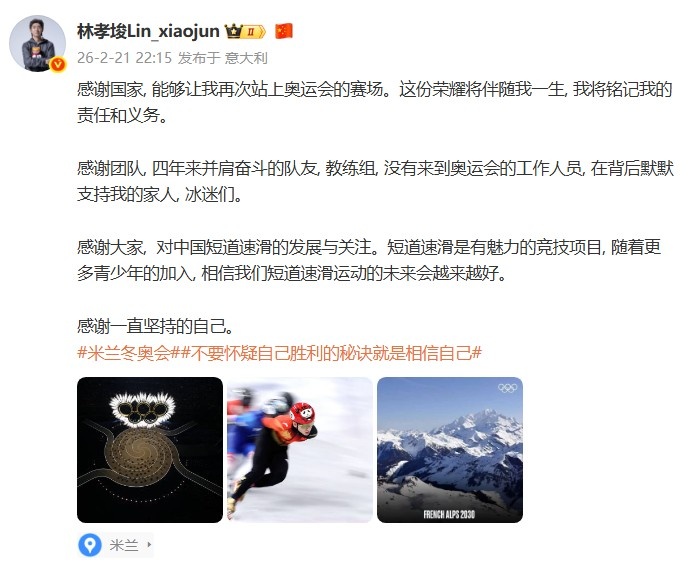 直播吧2月21日讯米兰冬奥会短道速滑项目比赛已全部结束,林孝埈以“无奖牌”的成绩遗憾收场。林孝埈在社媒分享自己赛场照片并向国家、团队和大家表示感谢。