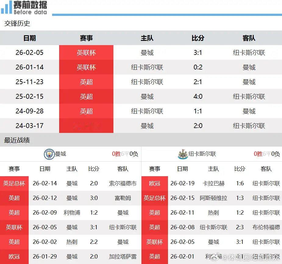 曼城vs纽卡斯尔前瞻:蓝月全力冲三分追榜首,纽卡客场难挡攻势北京时间2月22日凌晨4点,英超第27轮焦点战,曼城坐镇主场迎战纽卡斯尔联。一、两队近况&争冠格局英超26轮战罢,曼城16胜5平5负积53分,落后少赛一场的阿森纳5分。本赛季两队还有直接对话,曼城依旧手握争冠主动权。纽卡斯尔10胜6平10负积36分,暂列联赛第十。曼城上轮英超3-0完胜富勒姆,足总杯也2-0轻取索尔福德城晋级,状态稳定。纽卡斯尔则迎来一波强势客场三连胜:联赛2-1击败热刺、足总杯3-1淘汰维拉、周中欧冠附加赛客场6-1横扫卡拉巴赫,及时止住颓势。二、比赛核心看点:曼城抢分追榜首,纽卡体能+客场存隐忧阿森纳上轮2-2战平狼队丢分,给了曼城绝佳追分机会。曼城阵容相对齐整,罗德里状态逐步回暖,哈兰德破门效率回升,冬窗新援塞梅尼奥、格伊一攻一守表现出色。纽卡虽是客场三连胜,但球队整体偏“主场龙、客场虫”属性明显。曼城在英超主场面对纽卡斯尔已保持21场不败,瓜迪奥拉带队以来更是连续6次主场零封对手。加上纽卡周中多踢一场欧冠附加赛,体能处于劣势,此役曼城坐拥主场、阵容与体能多重优势,大概率全力争胜,拿下三分后将仅落后阿森纳2分,让英超争冠悬念继续保持。三、交锋&伤停近6次交手,曼城4胜1平1负占据上风。曼城伤停:多库、科瓦契奇、格瓦迪奥尔、阿莱恩纽卡伤停:维萨、吉马良斯、麦利、沙尔、克拉夫特、博特曼、利夫拉门托 cr:欧洲足球记录者