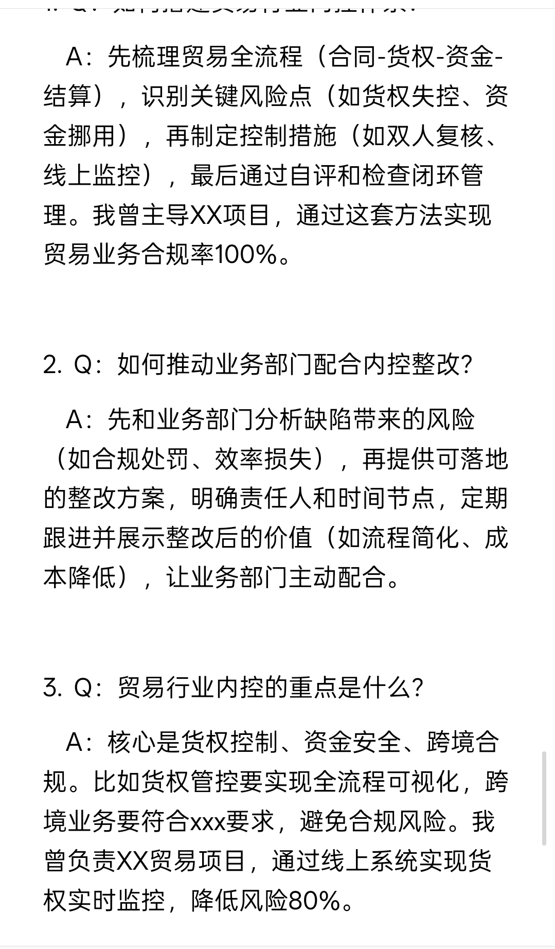 ✨简历亮点:“从贸易货权流程中识别重大风险点,推动流程优化,降低货权损失风险80%,保障业务安全运营。”