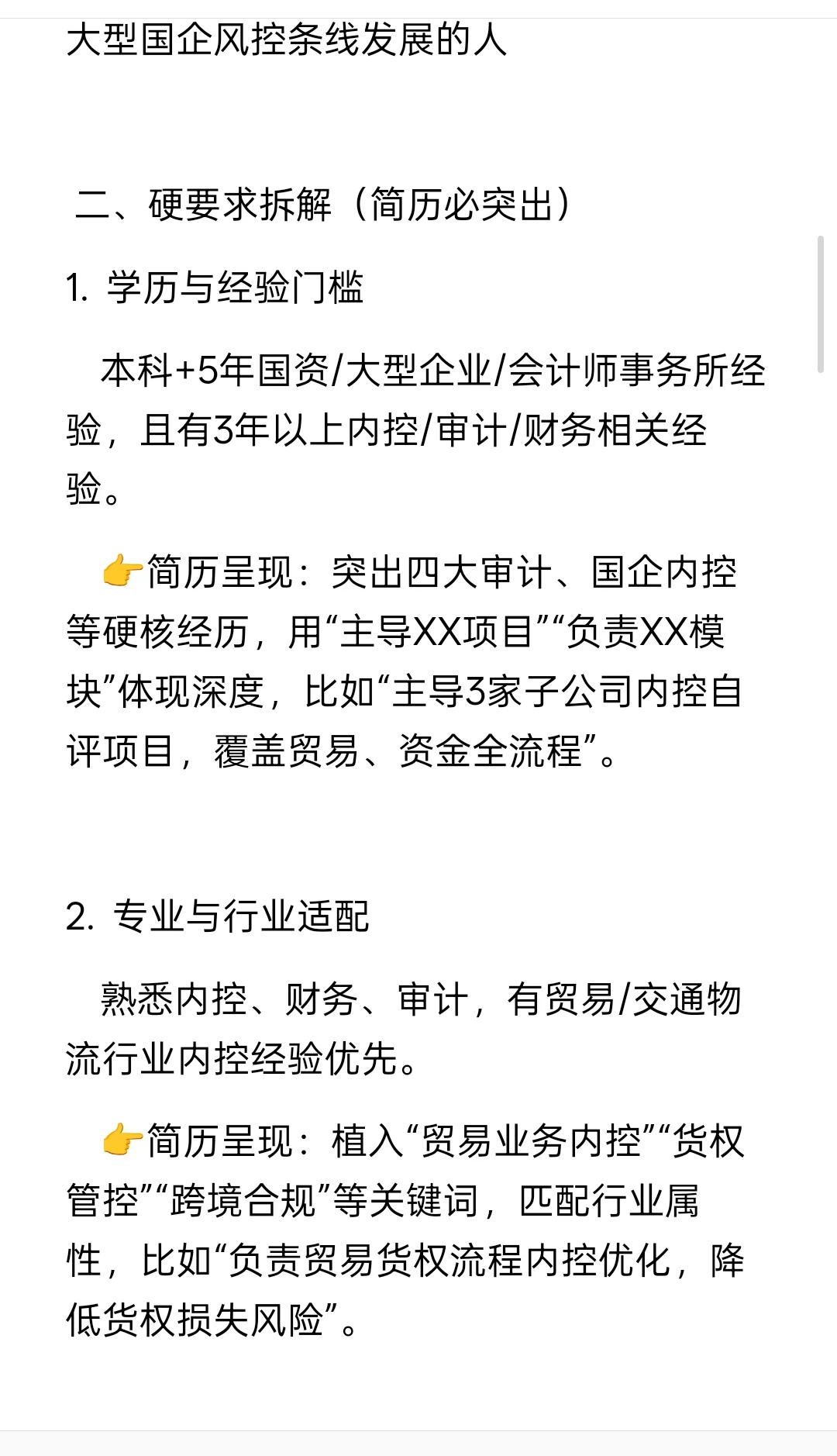👉简历呈现:突出四大审计、guo企内控等硬核经历,用“主导XX项目”“负责XX模块”体现深度,比如“主导3家子公司内控自评项目,覆盖贸易、资金全流程”。