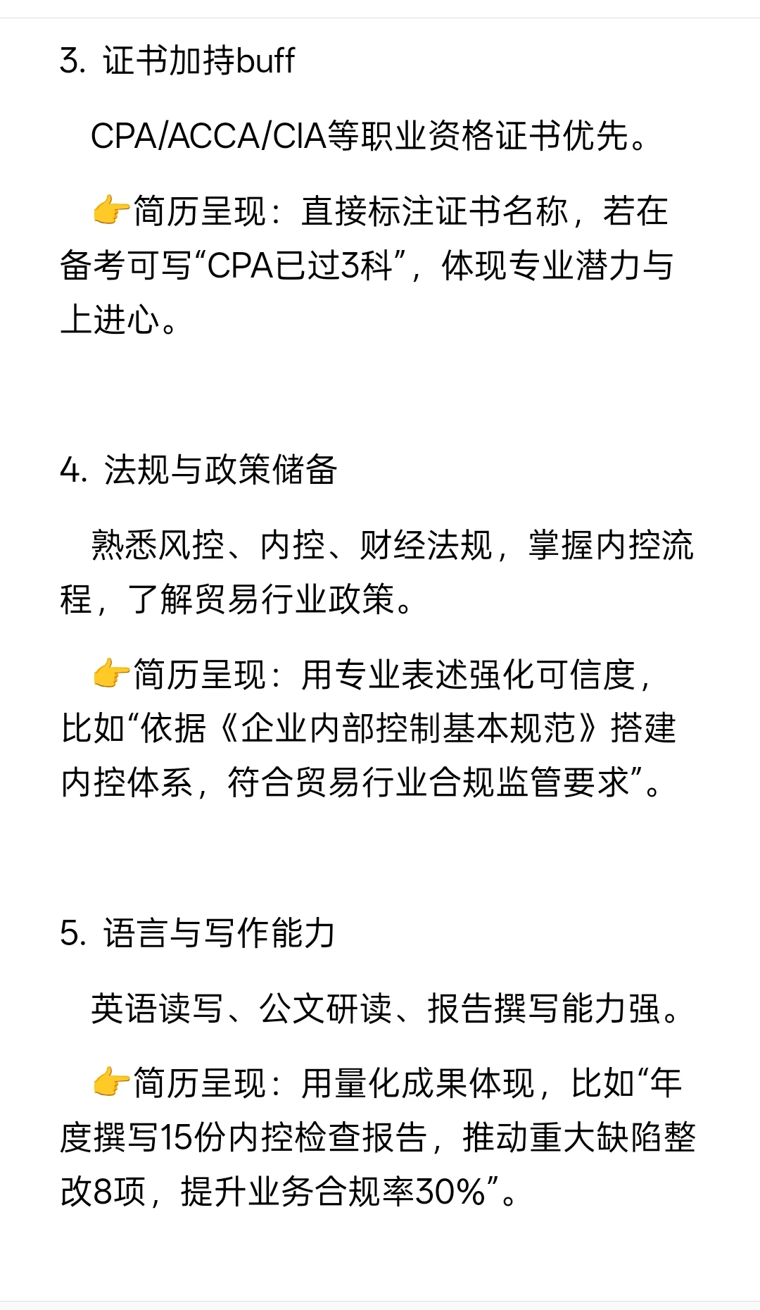 👉简历呈现:用专业表述强化可信度,比如“依据《企业内部控制基本规范》搭建内控体系,符合贸易行业合规监管要求”。