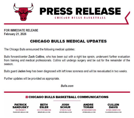 此外,扎克-科林斯将接受右脚趾手术,赛季报销。