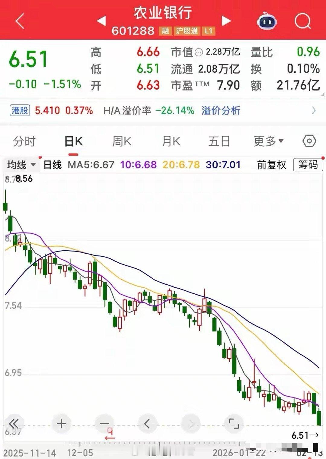 农业银行堪称“先涨后跌”的典型。作为万亿市值的大盘股,它曾从2.1元飙升至8.5元,三年涨超三倍,风头无两。但从高点8.56元跌至目前的6.51元,仅用3个月就跌去24.2%,且仍在下跌通道中。高股息率是它的标签,当前3.80%的股息率虽随股价下跌有所提升,但对高点追入的投资者而言,若仅靠股息填补亏损,可能需要7年。不过其7.9倍的市盈率仍处于相对合理区间,加上53.982万股东同比增长9.82%,可见下跌中已有资金抄底,只是短期止跌信号尚未明确,抄底时机仍需谨慎把握。