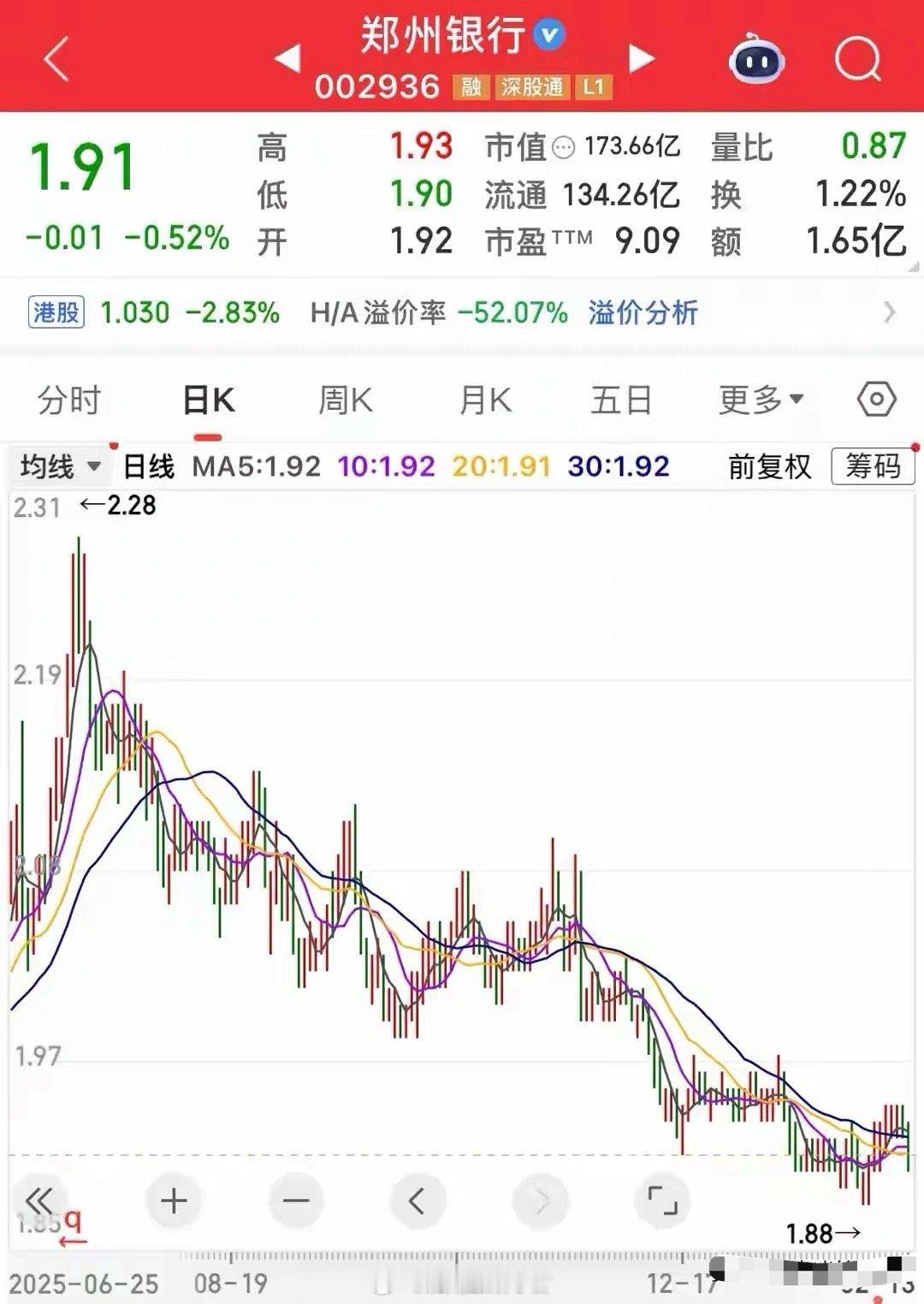 郑州银行以1.91元的股价成为银行股中的“价格洼地”,但分红能力较弱——2025年每10股仅分红0.2元,股息率仅1.05%。年内从2.41元跌下,跌幅20%,而自2018年上市后,除了初期冲高至5.87元,多数时间处于下跌震荡中。对被套投资者而言,想靠股息解套难度极大。9.09倍的市盈率、仅0.04%的股东增长,也反映出市场对其信心不足。