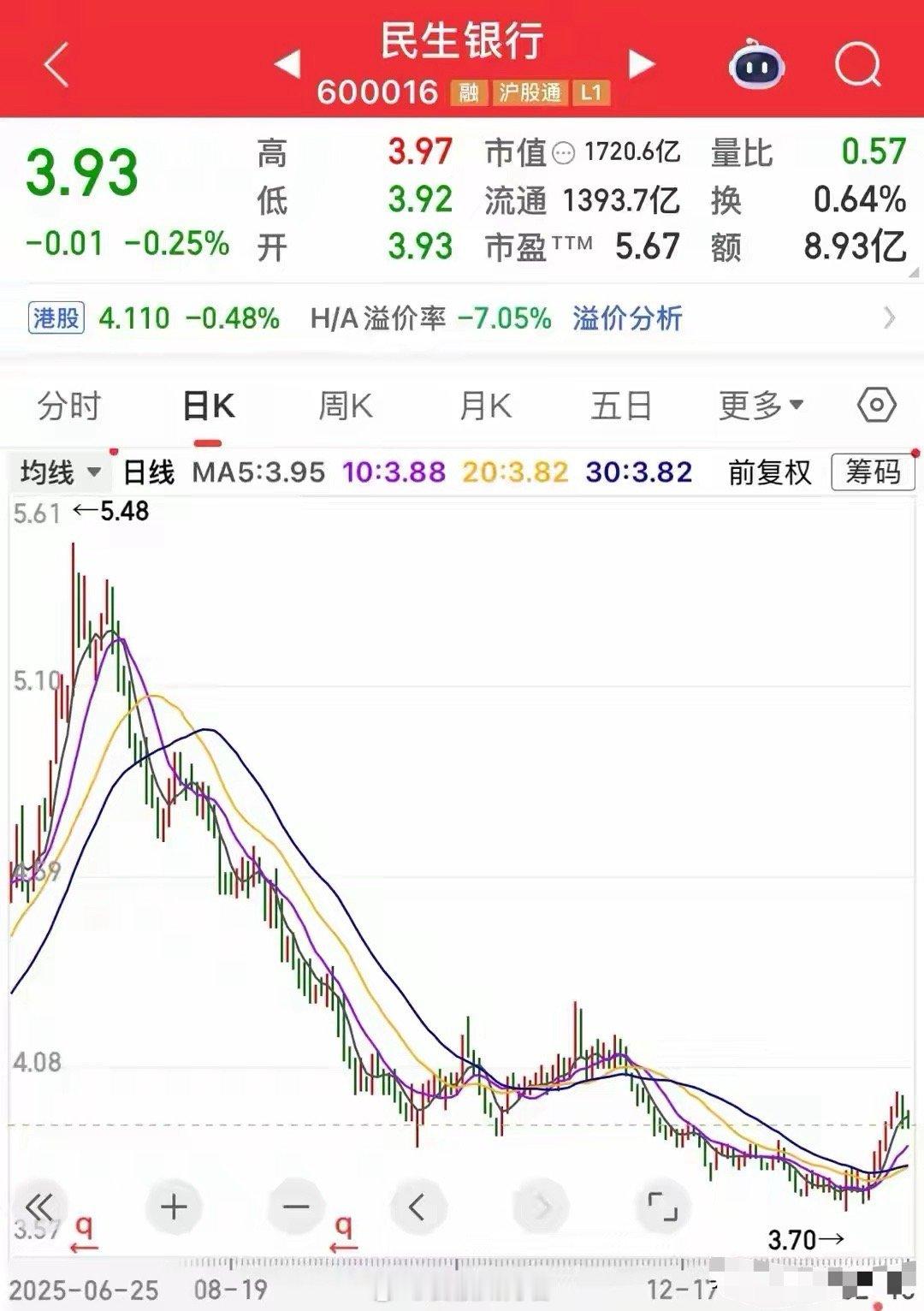 民生银行则属于“涨少跌多”的类型。从去年7月的短期高点5.48元跌至3.93元,跌幅达36.5%,且这轮银行行情中并未创下新高。尽管近期曾连收6根阳线,却很快再度回落。5.04%的股息率看似可观,但对高位套牢者来说,同样需要约7年股息才能覆盖亏损。33.61万的股东数同比增长12.26%,显示抄底资金同样活跃,只是反弹动能不足,仍受板块回调拖累。