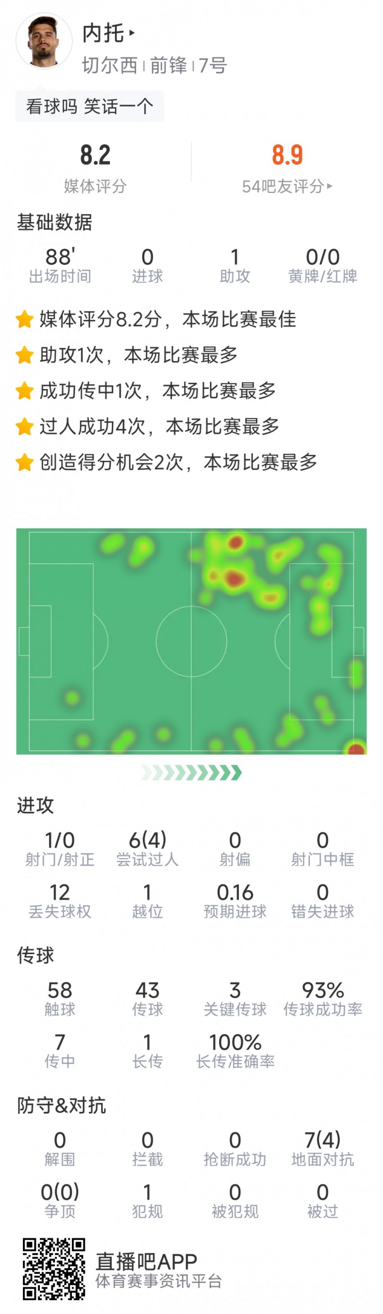 直播吧2月22日讯在本轮英超,切尔西1-1战平伯恩利,内托送出助攻,以下为他在本场数据: