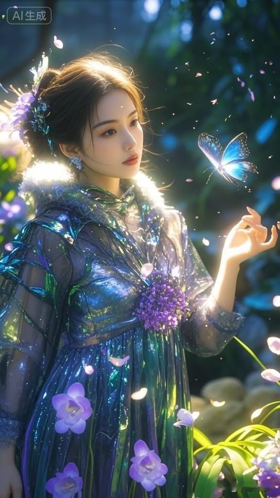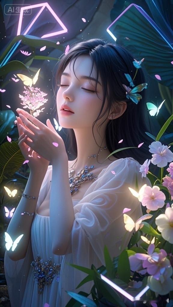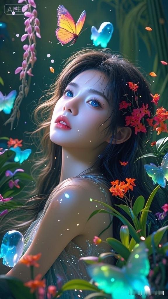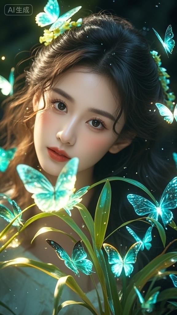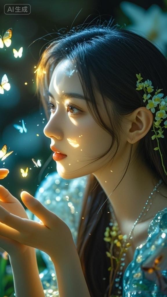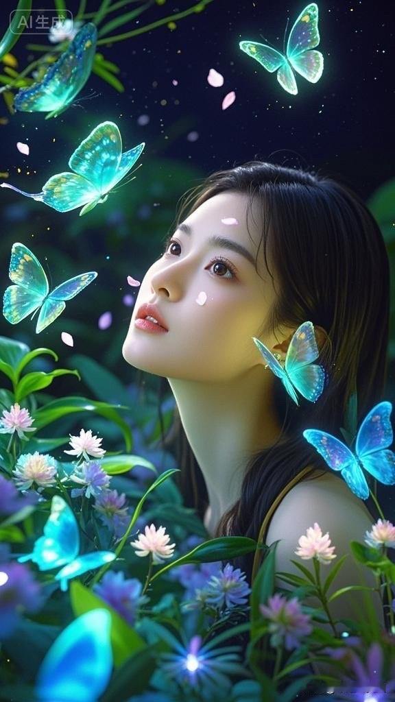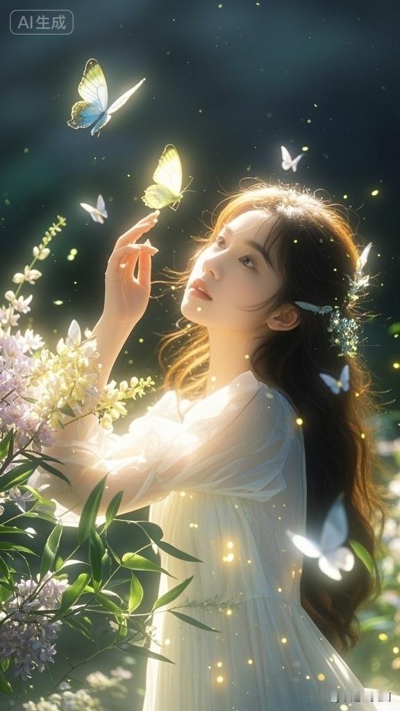 梦幻森林中的少女与发光蝴蝶,唯美仙境