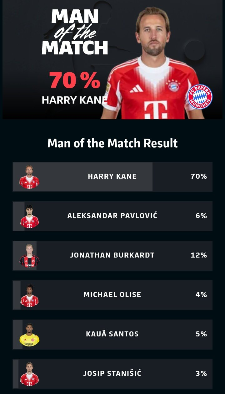 70%得票率,凯恩当选拜仁vs法兰克福全场最佳球员