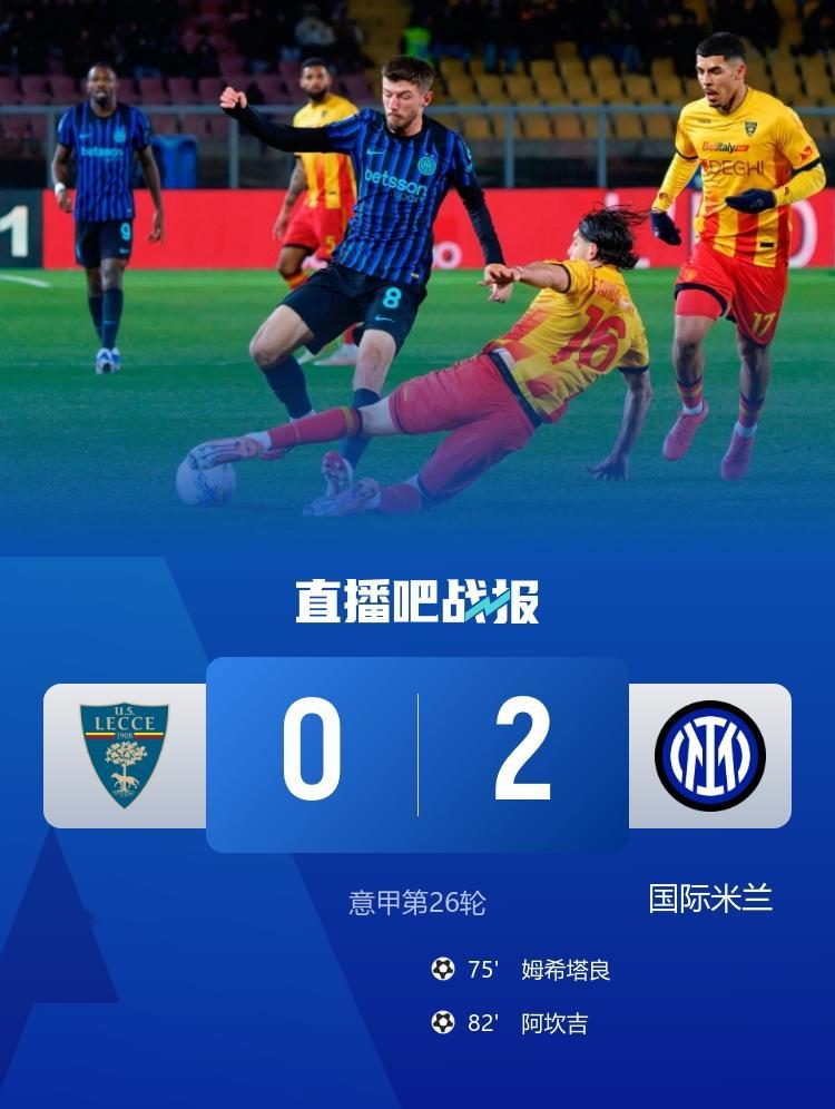 直播吧2月22日讯北京时间2月22日凌晨1时整,2025-26赛季意甲第26轮在维亚·德尔·马雷球场展开角逐,国际米兰客场对阵莱切。上半场恩里克遭门线解围,下半场迪马尔科进球无效后送角球助攻,姆希塔良替补破门,阿坎吉头球扩大比分。最终国米客场2-0战胜莱切,国米取得联赛7连胜+14轮不败,先赛积64分继续领跑,领先第2名米兰10分。