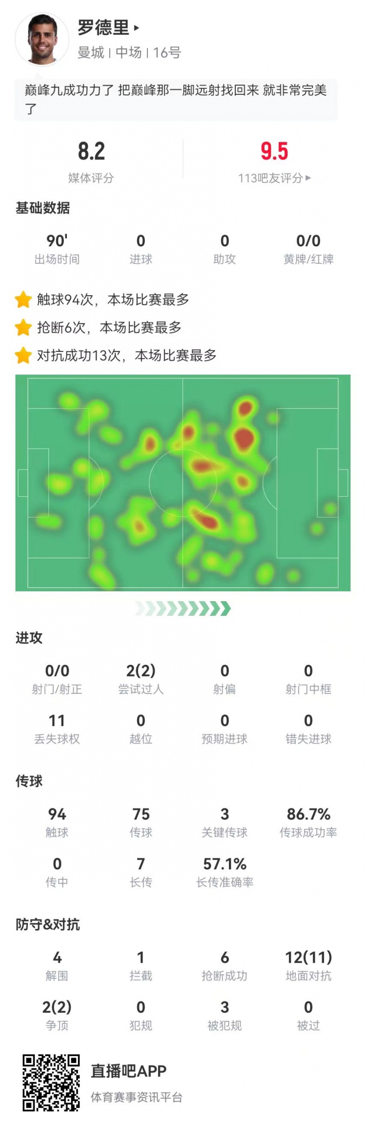 直播吧2月22日讯曼城在本轮英超对阵纽卡,罗德里本场数据如下: