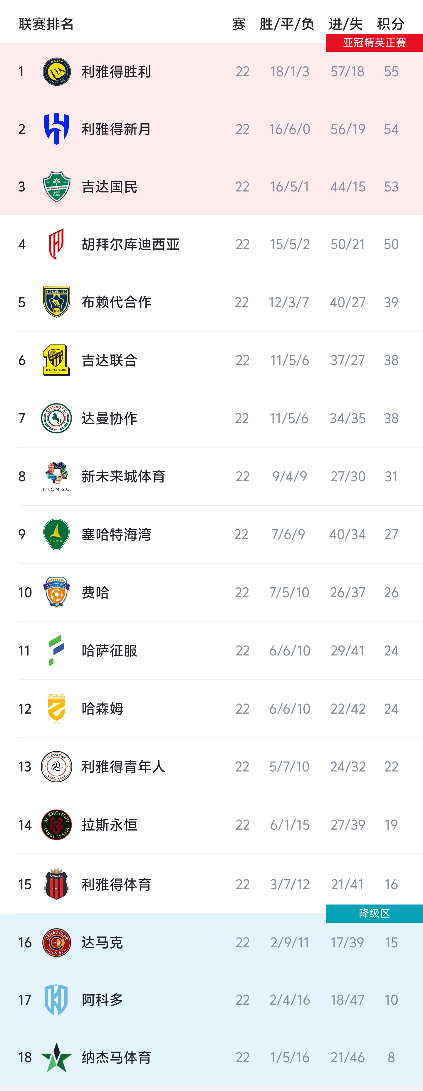 虎扑02月22日讯在今夜的几场沙特联关键战结束后,沙特联积分榜也迎来了更新。