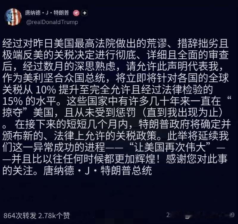 一大早,懵逼了! 又变了?!特朗普关税政策又变了! 从10%变成15%了。[捂脸][捂脸][捂脸]我滴个乖乖,这是个啥速度啊!看来这几天全世界各国不能随便制定反制措施啊,因为你制定了也没用,变化太快了。 当然,也看出特朗普对美最高法院作出的关税最终裁定简直是气晕了吧?用他的话说他是对的,他没有错,他就是想让美国过再次伟大!伟大!伟大!