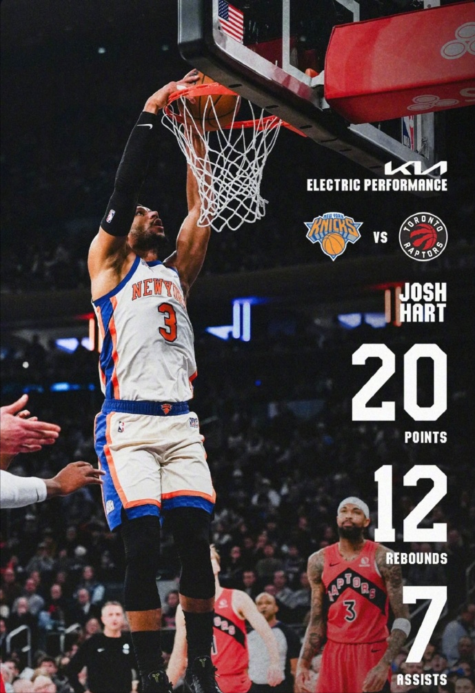 尼克斯今天有6人得分上双,唐斯稳定发挥,出战31分钟,15投8中,三分4中1,罚球7中5,砍下22分8篮板2助攻。哈特表现出色,高效又全面,出场35分钟,投篮12中8,三分球7中4,拿到20分12篮板7助攻3抢断的数据,正负值+24。
