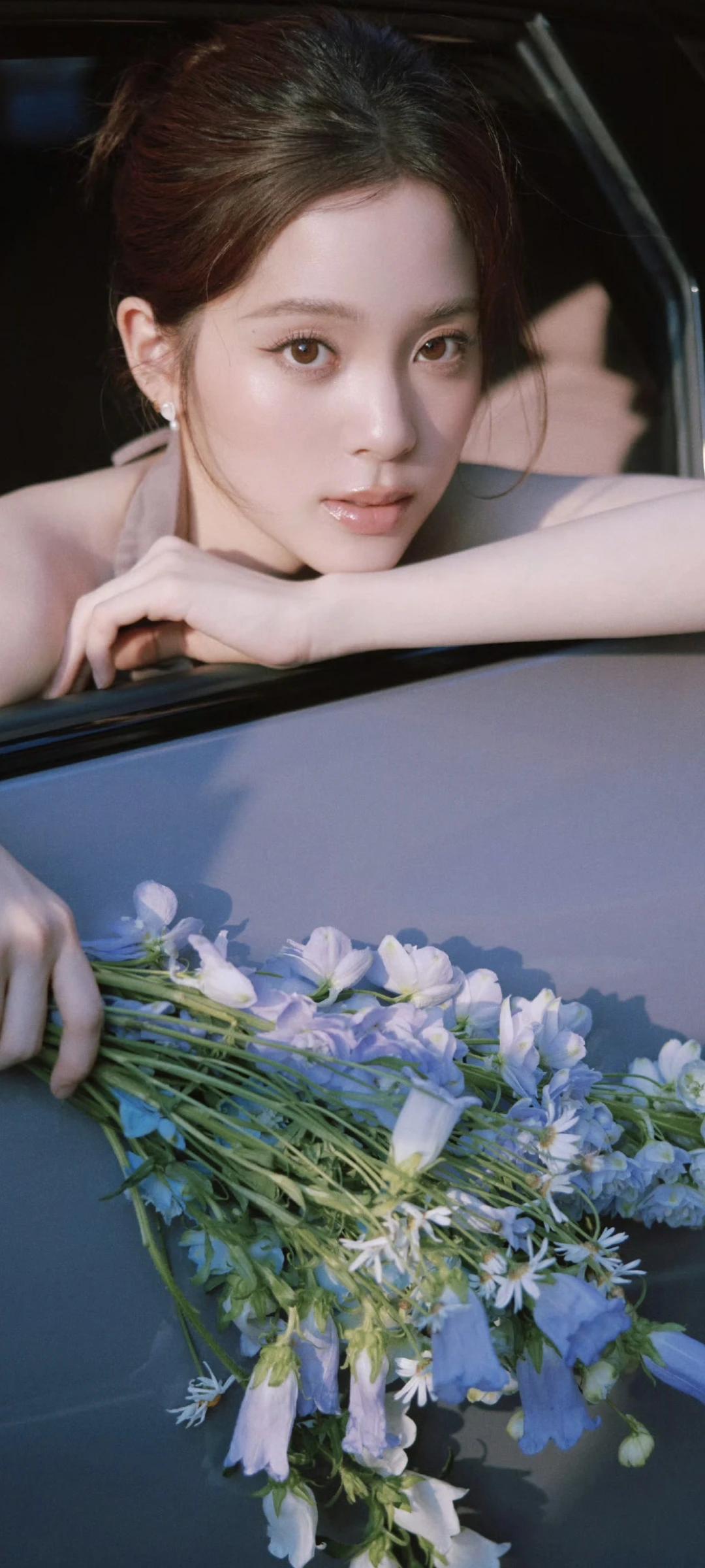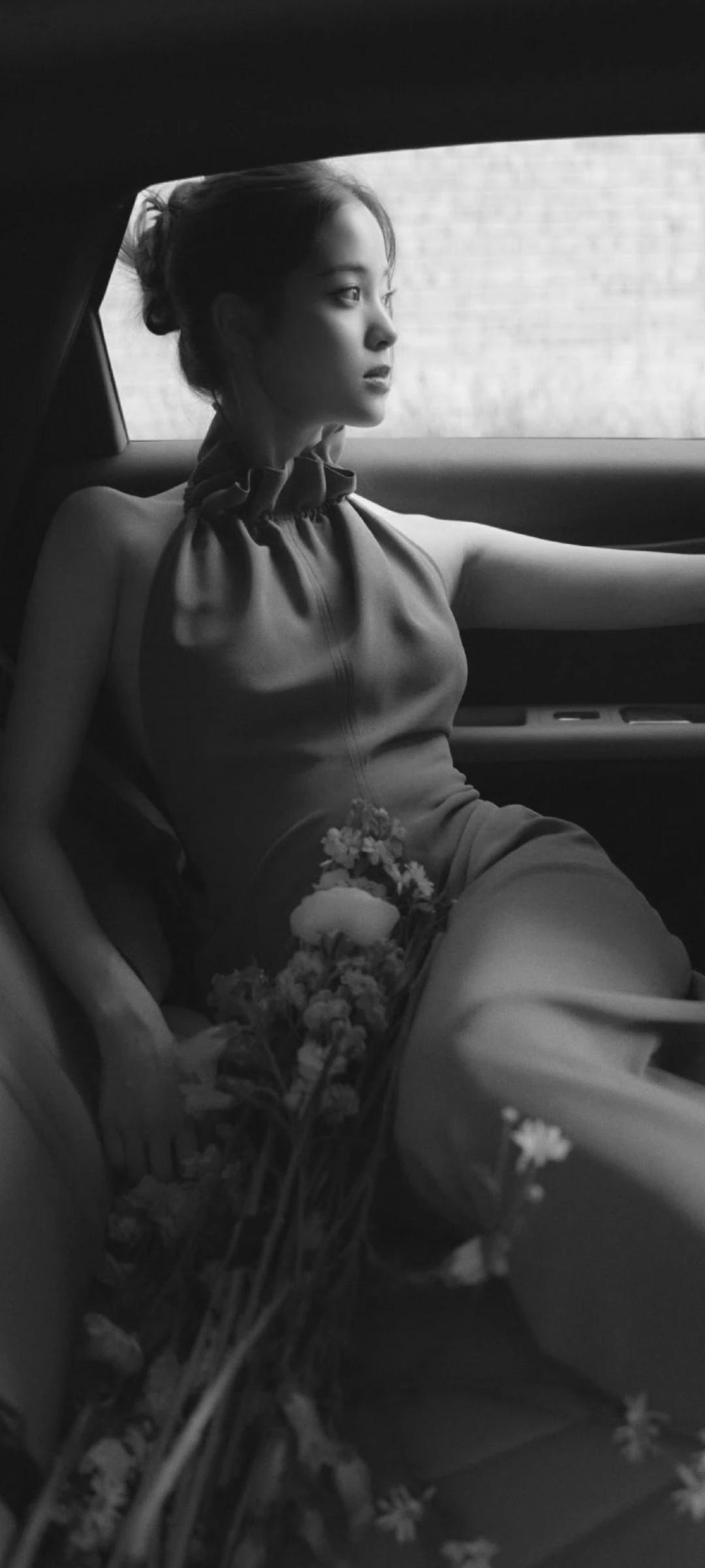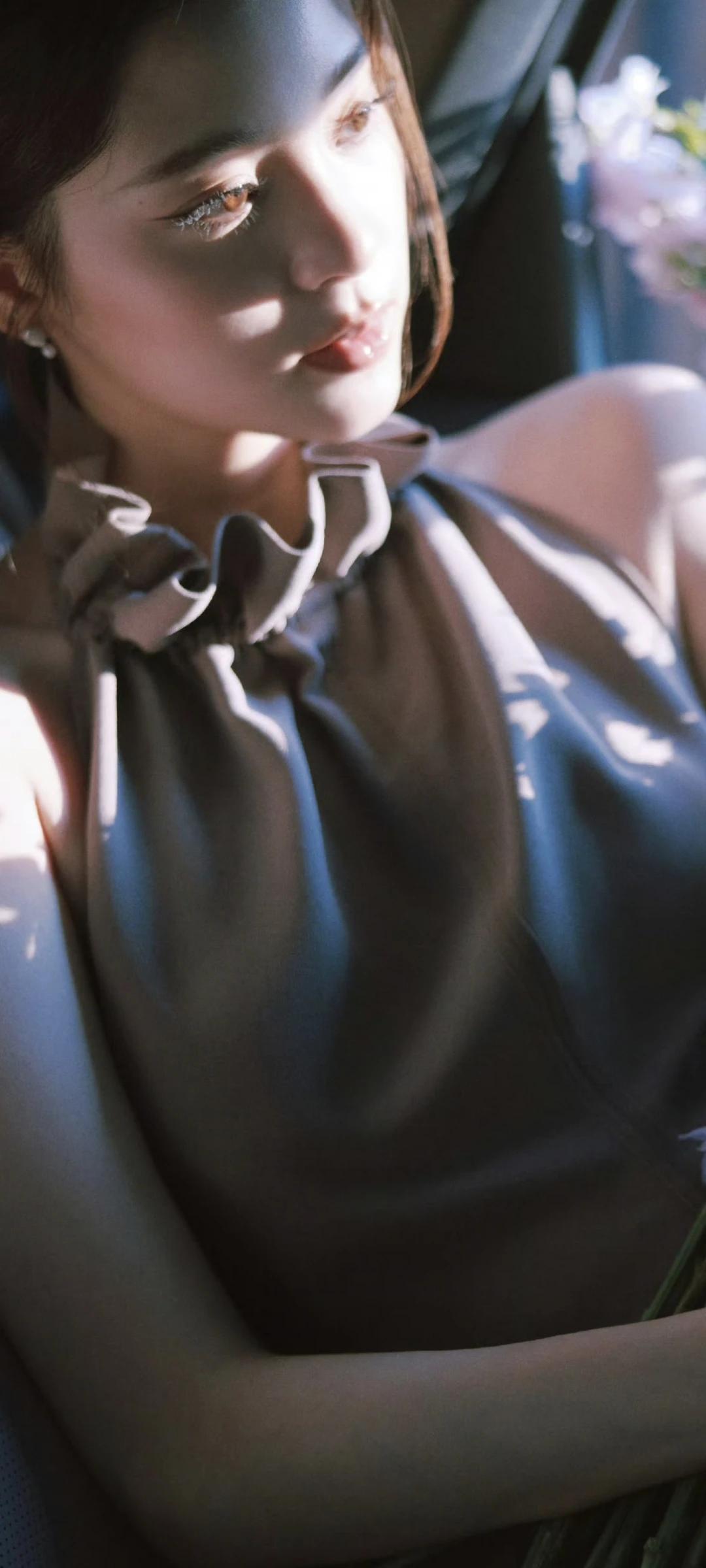 欧阳娜娜写真壁纸~温柔挂脖裙+慵懒盘发,手捧花束倚在车窗,这画面太治愈了!