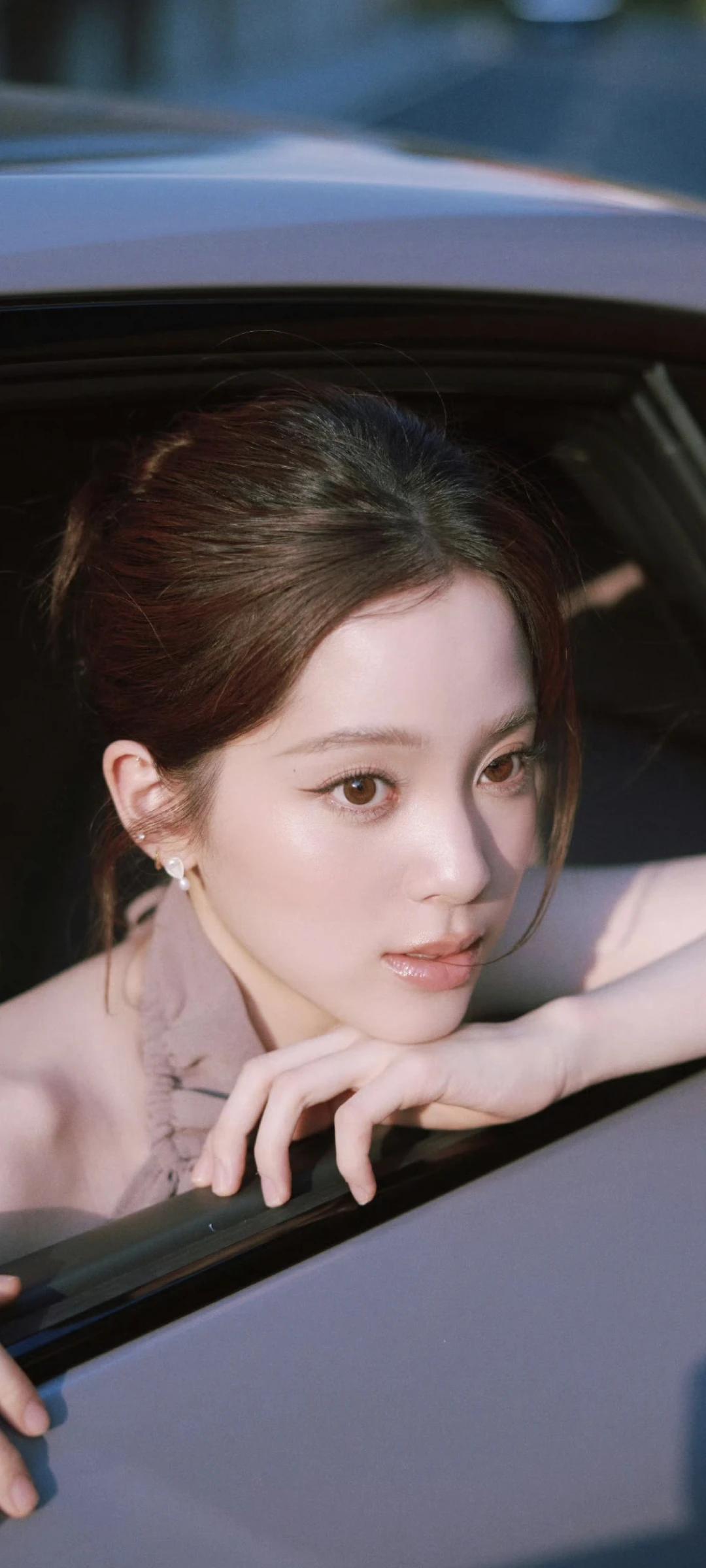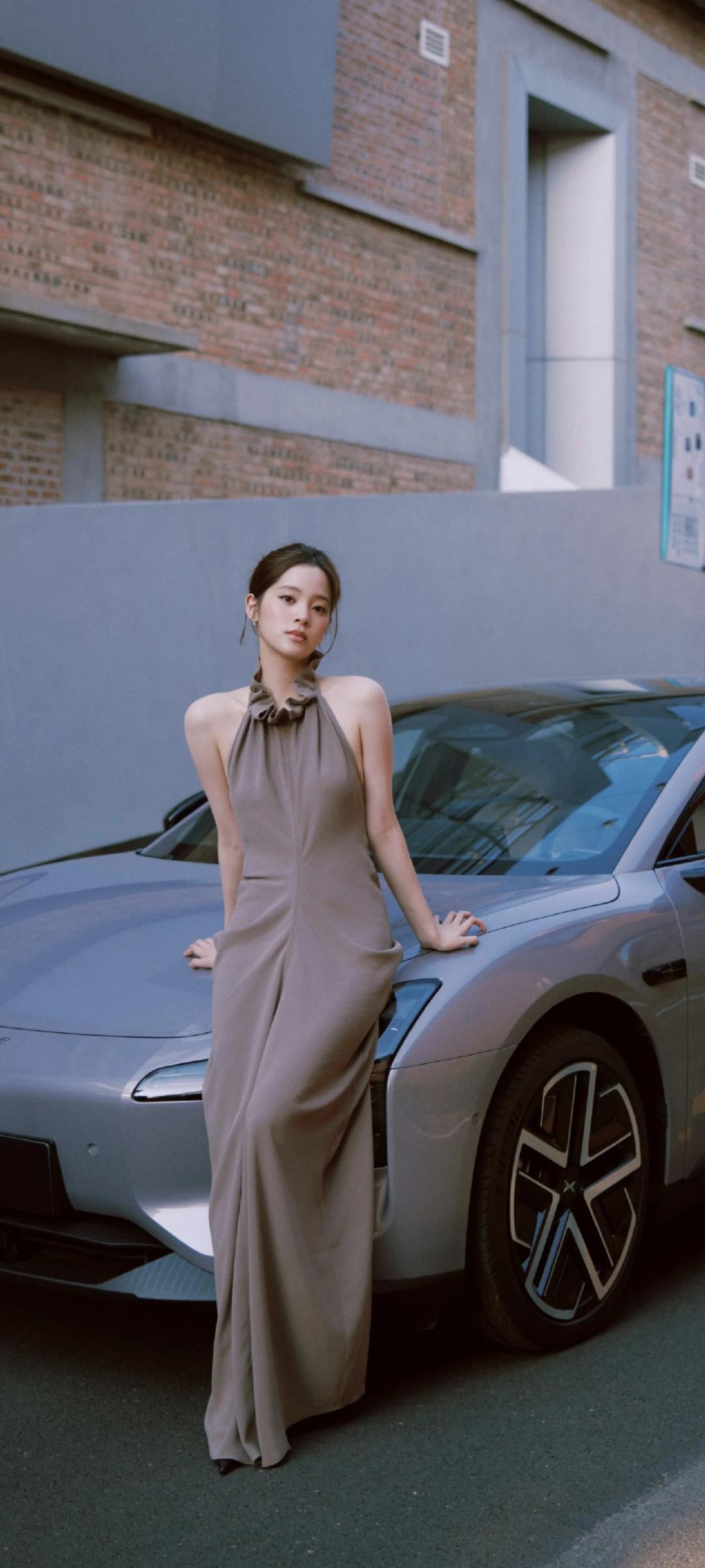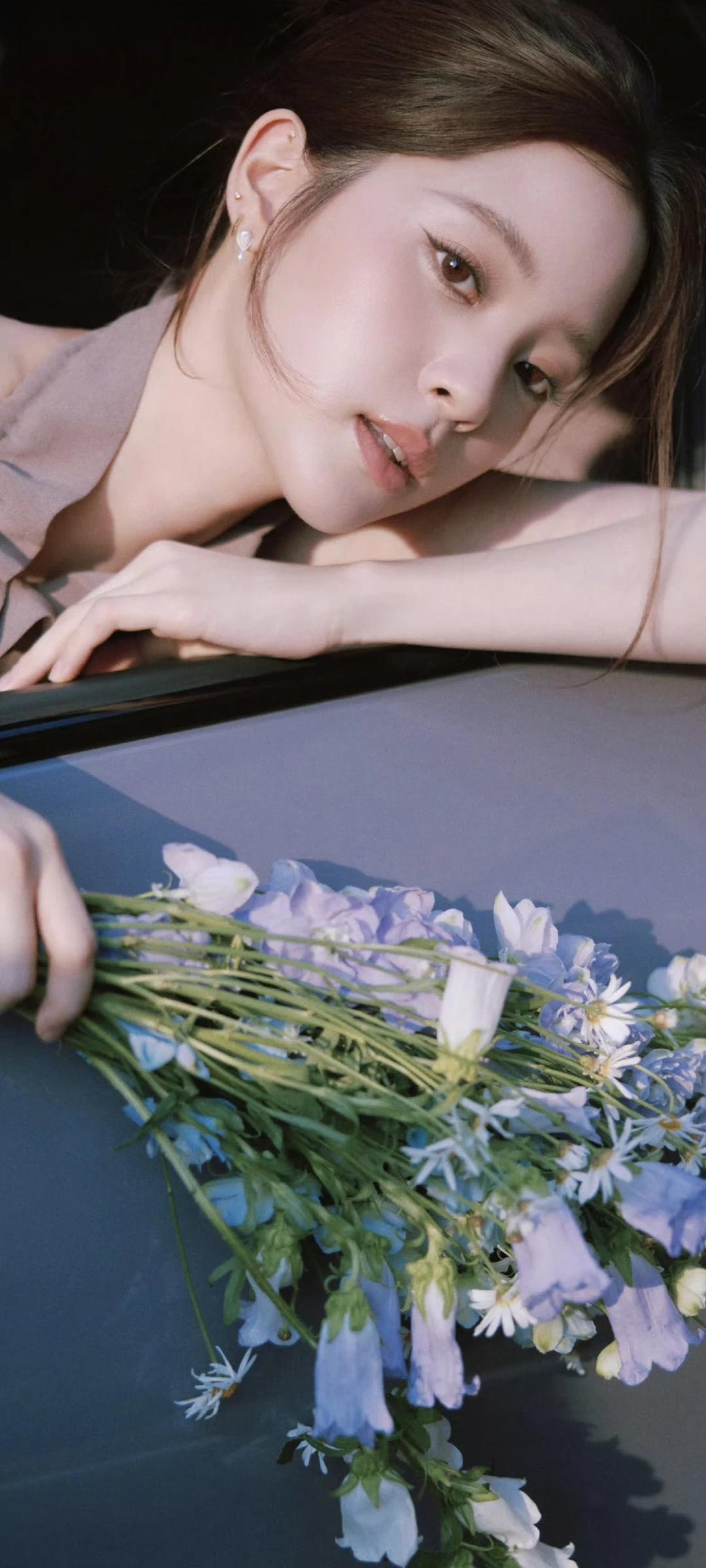 欧阳娜娜写真壁纸~温柔挂脖裙+慵懒盘发,手捧花束倚在车窗,这画面太治愈了!