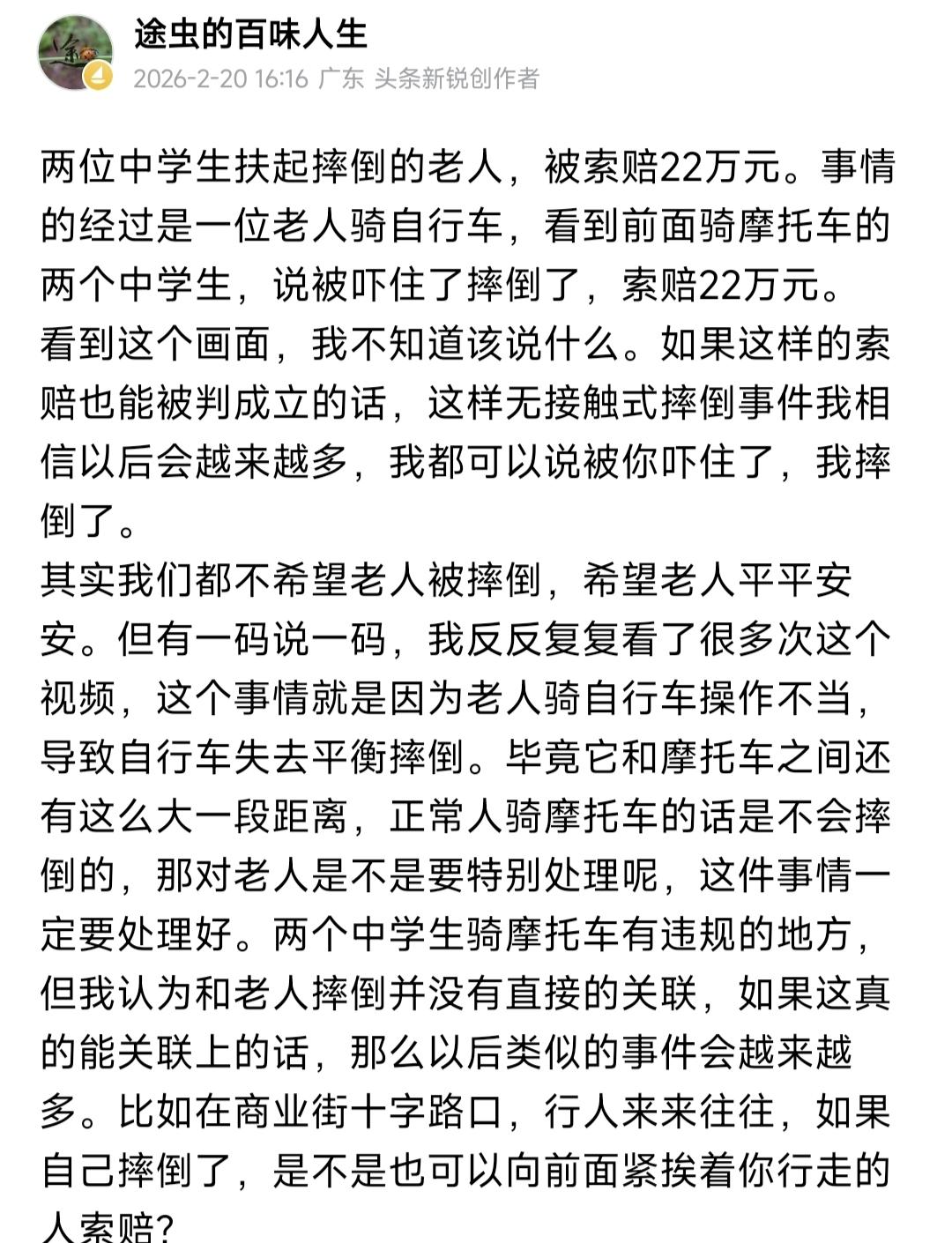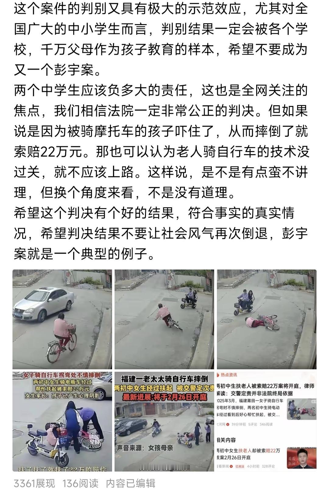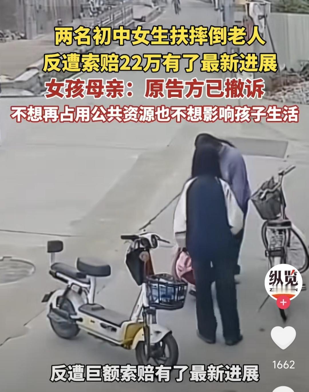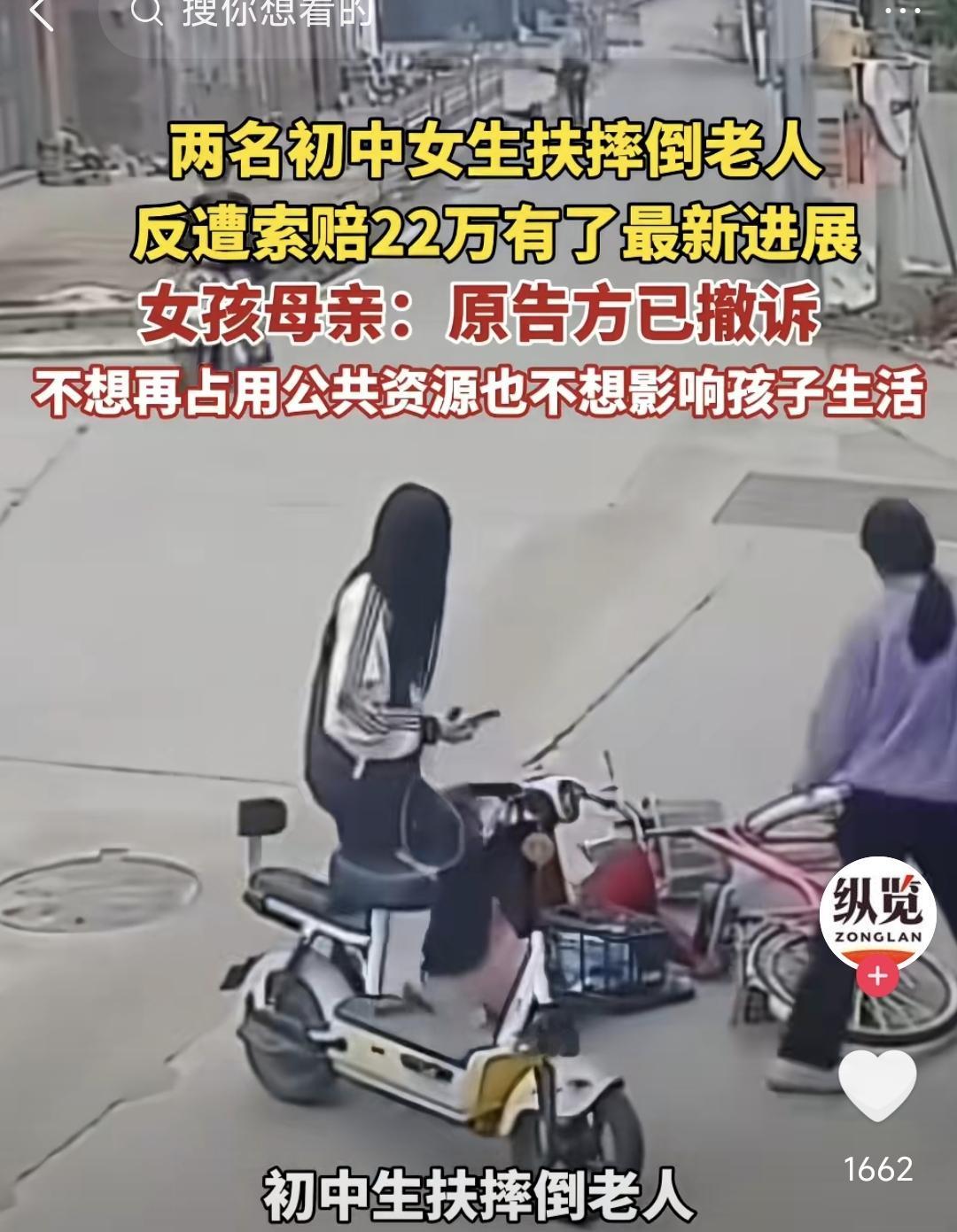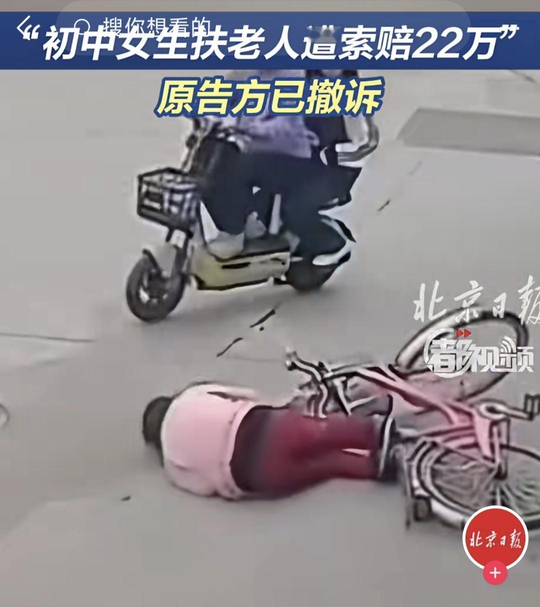 一觉醒来,备受关注的两名初中生扶起摔倒老人,反遭索赔22万元的事情有了新进展。原告方已经撤诉,说是不想占用公共资源。 其实这件事情幸好有了公共资源,那位老人和家属能够撤诉,和网友的努力不无关系。我还是坚持我自己的观点,这个视频看了无数遍,因为老人骑自行车技术不过关术,刹车时拼命按压前刹导致,她的摔倒和两个女孩骑摩托车没有直接联系。如果这也可以判无接触碰撞索赔22万元赔偿的话,那么以后整个社会都是这种无接触式碰撞。 但这件事情已经造成了很大的负面影响,距上一次那个法官判决之后,扶还是不扶,估计又会被大家拿出来狠狠的掂量一番。现在社会上也有不少这样的例子,老人摔倒,周围的人围观,不是人情的冷漠,而是没有办法。但我们的社会本应该是向善向美向阳的,这样的现象都是不正常的。头号创作者激励计划 扶起老人被讹 扶人事件