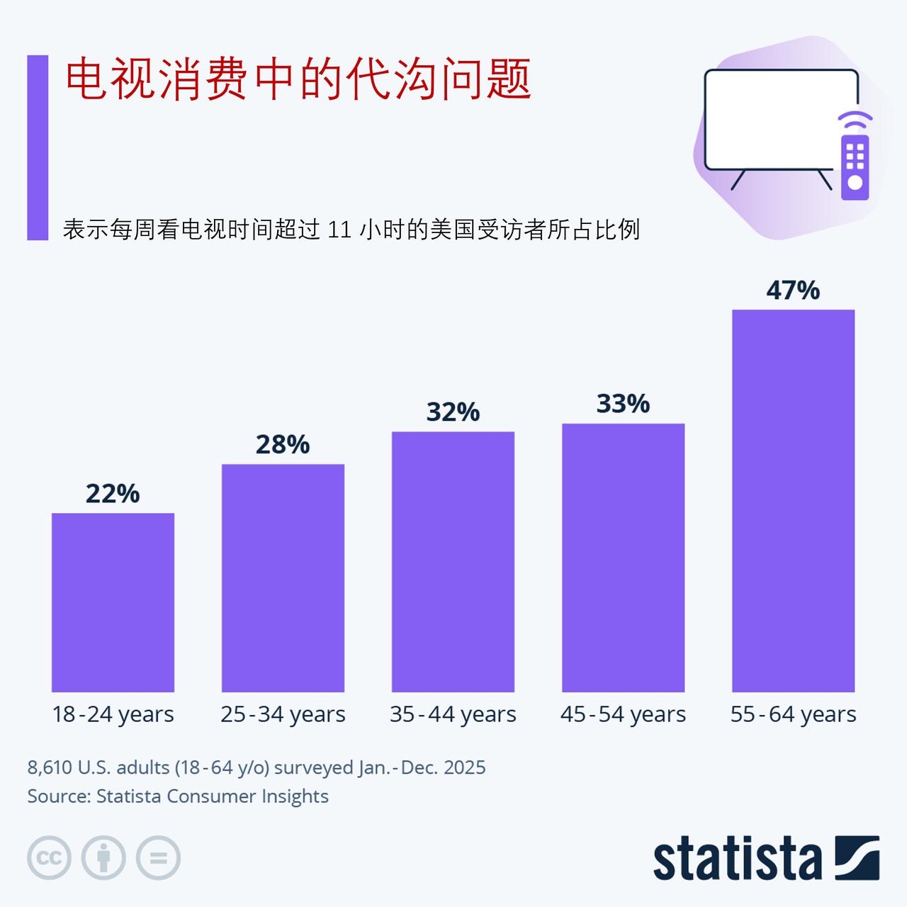 “看电视”意味着什么?来看不同时代人对“看电视”的定义以及电视消费中存在的代沟 在电视首次向公众展示其神奇之处的一百年后,“看电视”这一行为已经变得复杂起来。对于许多年长的美国人来说,它仍然意味着那种传统的场景:一个大屏幕、一张沙发以及按照固定时间表播放的内容。然而对于年轻一代而言,视频就是视频,无论它是备受赞誉的电视剧还是你在无意间观看的、但最终却看了 12 部的 Instagram 上短短 30 秒的视频片段(尽管你根本没打算去看)。 这种在视频内容感知方式上的代际差异在数据中表现得十分明显:根据德勤对美国超过 3500 名消费者的调查,约有一半的 Z 世代和千禧一代受访者认为观看社交媒体视频与观看电视并无太大区别。而在婴儿潮一代和中老年人中,只有 22%和 10%的受访者认为这两者本质上是一回事。而且,不仅仅是“线性”电视节目受到了年轻人喜爱短片和剪辑节目的影响:德勤发现,近 60%的 Z 世代受访者表示,他们在社交媒体上观看视频所花费的时间比在流媒体服务上观看视频的时间还要多。 随着电视、流媒体和社交媒体之间的界限变得愈发模糊,要衡量我们所有人究竟在观看多少“电视节目”变得愈发困难,因为我们所指的已经不再是同一种东西了。而尽管年长的消费者仍在适应流媒体服务,但最年轻的群体已经转向了新的事物。 或许对“传统”电视的主要威胁并非美国人不再观看视频内容,而是视频无处不在。尤其是年轻美国人,他们往往在“零食区”满足自己的视频需求,即在 TikTok、Instagram 或 YouTube 上,短视频、故事集、精彩片段或算法推送的下一个内容占据了越来越多的屏幕时间。 这有助于解释为何电视重度使用者年龄偏大。据 Statista 消费者洞察数据,调查中年龄最大的一组,即 55 至 64 岁的人群中,有 47% 的受访者每周看电视超过 11 个小时。而在最年轻的一组,即 18 至 24 岁的人群中,只有 22% 的受访者表示每周看电视超过 11 个小时。所以,尽管电视仍具有很强的生命力,但它在一个日益拥挤的视频世界中竞争,对于年轻人来说,他们不再默认问“今晚有什么节目?”而是问“接下来有什么?”
