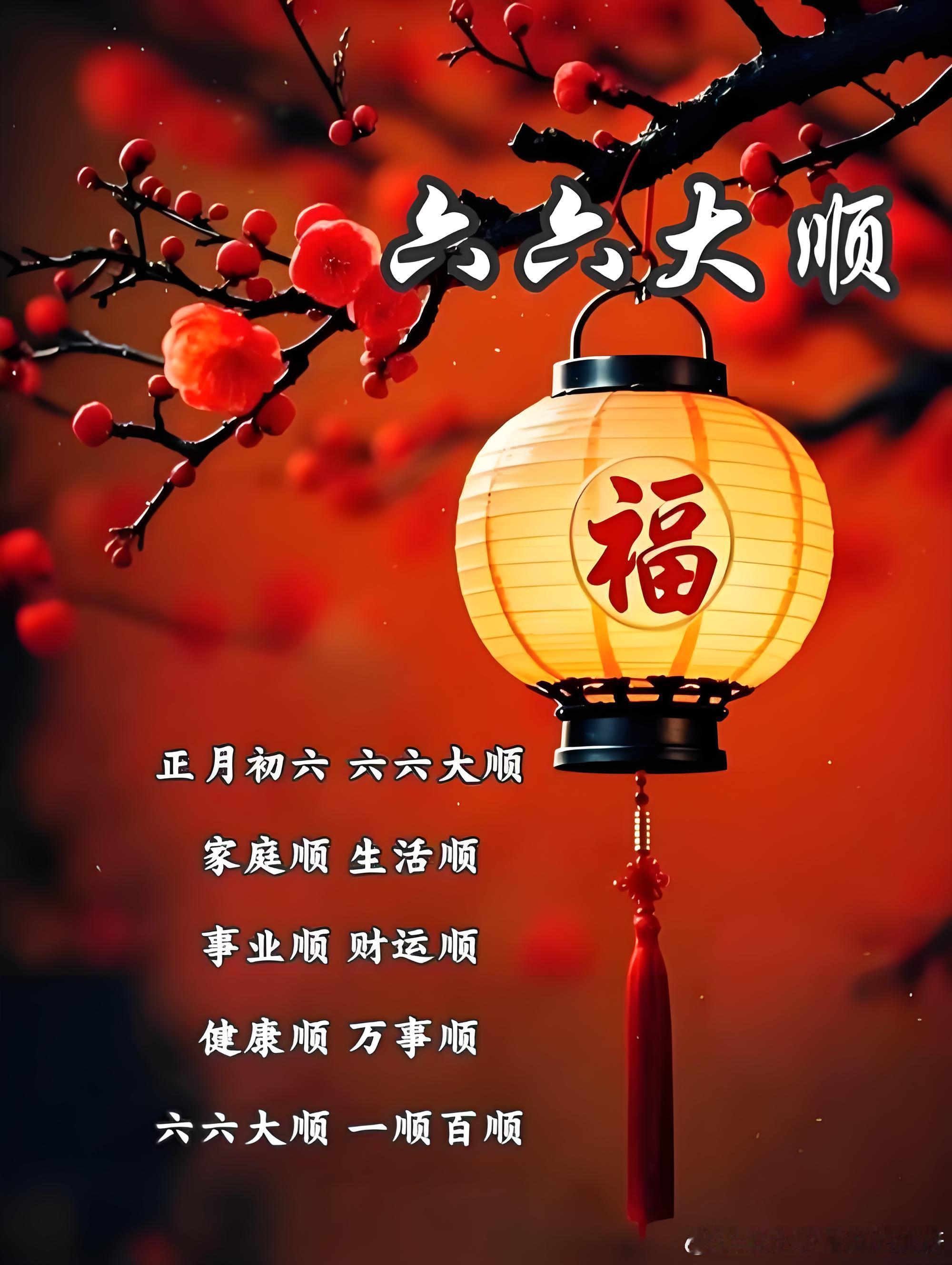 🧨 🏮🧧🎉今天是大年初六,迎六顺,祝:顺风顺水顺财神,家顺人顺万事顺!新的一年,身体顺,心意顺,家运顺,前程顺,一顺百顺千日顺,现在顺,将来顺,一直顺心如意!祝:新年鸿运当头,万事顺遂!大年初六送穷大年初六祝你顺风顺水顺财神