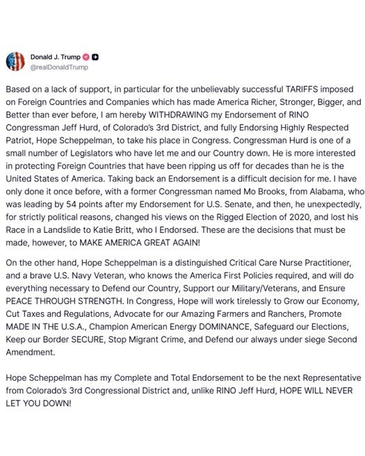 在美国众议员杰夫·赫德(Jeff Hurd)公开反对特朗普的关税政策后,特朗普总统撤回了对赫德的支持(R-CO)。特朗普现在转为支持霍普·谢佩尔曼。这是特朗普第二次撤回对他的支持: “鉴于缺乏支持,尤其是不支持对外国和企业征收的、极其成功的关税政策——正是这些关税政策使美国比以往任何时候都更加富裕、强大、繁荣和繁荣——我在此撤回对科罗拉多州第三选区“名义上的共和党人”杰夫·赫德议员的支持,并全力支持备受尊敬的爱国者霍普·谢佩尔曼接替他在国会的席位。赫德议员是少数几位让我和我们国家down.感到失望的立法者之一。他更关心的是保护那些几十年来一直在剥削我们的外国,而不是美国。撤回支持对我来说是一个艰难的决定。我之前只这样做过一次,对象是来自阿拉巴马州的前国会议员莫·布鲁克斯。在我支持他竞选美国参议员之后,他一度领先54个百分点。然而,出乎意料的是,他出于纯粹的政治原因,改变了对2020年选举舞弊的看法,最终惨败给了我支持的凯蒂·布里特。但是,为了让美国再次伟大,我们必须做出这样的决定! 另一方面,霍普·谢佩尔曼是一位杰出的重症监护专科护士,也是一位勇敢的美国海军退伍军人。她深谙“美国优先”政策的必要性,并将竭尽全力捍卫我们的国家,支持我们的军人和退伍军人,并通过实力确保和平。在国会,霍普将不遗余力地发展经济,削减税收和监管,为我们杰出的农民和牧场主争取权益,推广“美国制造”,捍卫美国能源主导地位,保障选举安全,维护边境安全,打击移民犯罪,并捍卫我们始终受到威胁的第二修正案。 我完全支持 霍普.谢佩尔曼Hope Scheppelman 成为科罗拉多州第三国会选区的下一任众议员,而且,与共和党建制派 杰夫.赫德Jeff Hurd 不同,霍普Hope 永远不会让你失望!”