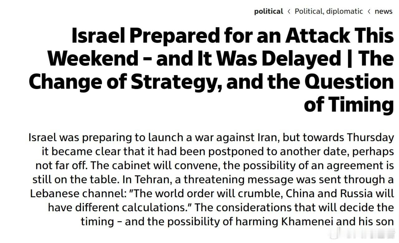 以色列安全官员表示,以色列一直在为美国可能在周末对伊朗发动的袭击做准备,但原定于周四实施的行动被推迟。消息人士指出,推迟时间可能不会太久。