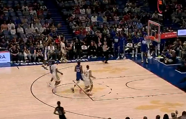 比赛的第一节,马克西压哨三分投进被判超时,76人首节29-24领先鹈鹕。