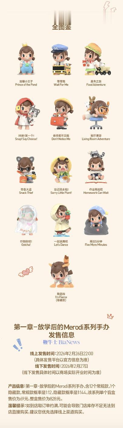 官方介绍,放学后的Merodi系列单个盲盒售价为69元,整盒售价为828元。线上发售时间为2026年2月26日22:00,线下发售时间为2026年2月27日。