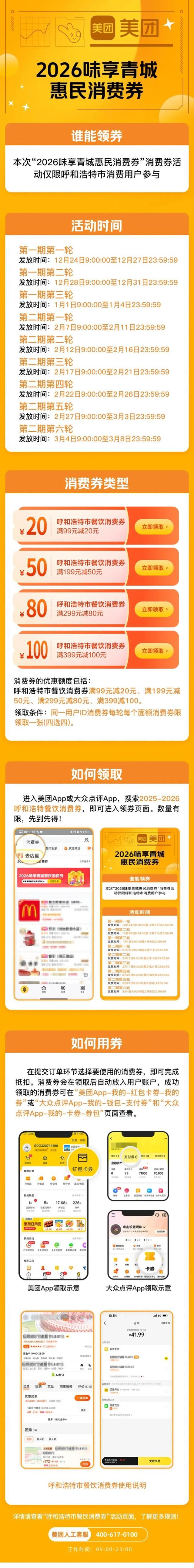 呼和浩特市内消费者可通过扫描美团APP申领通道二维码或登录美团APP搜索“2025-2026年呼和浩特餐饮消费券”进入活动专区领券,在参加活动的实体店就餐,并使用美团APP付款时直接抵用。成功领取的消费券可在“美团App-我的-红包卡券-我的券”页面查看。