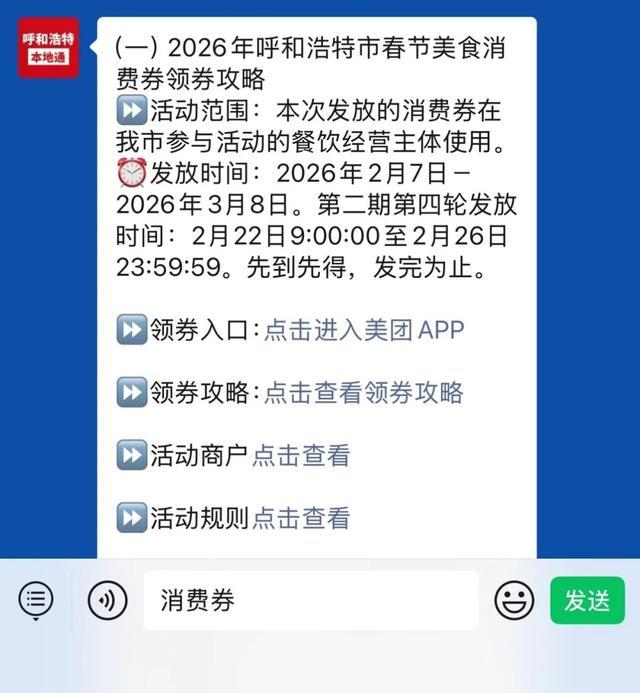 提醒:在『呼和浩特本地通』聊天对话框内发送[消费券]即可获取美团APP领券入口及活动规则、领取攻略、活动商户等。(本地通非活动主办方)见下图: