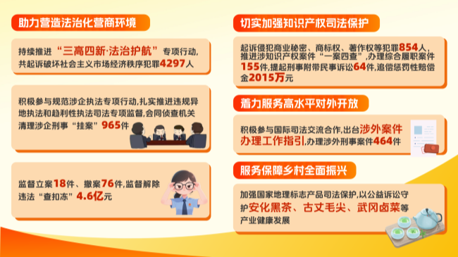 据了解,2025年,湖南省检察机关认真贯彻落实党中央决策部署和湖南省委、最高检工作要求,切实强化检察履职担当,全力护航高质量发展。持续推进“三高四新·法治护航”专项行动,共起诉破坏社会主义市场经济秩序犯罪4297人,积极参与规范涉企执法专项行动,扎实推进违规异地执法和趋利性执法司法专项监督,会同侦查机关清理涉企刑事“挂案”965件,监督立案18件、撤案76件,监督解除违法“查扣冻”4.6亿元,助力营造法治化营商环境;加强知识产权司法保护,起诉侵犯商业秘密、商标权、著作权等犯罪854人,推进涉知识产权案件“一案四查”,办理综合履职案件155件,提起刑事附带民事诉讼64件,追偿惩罚性赔偿金2015万元;积极参与国际司法交流合作,出台涉外案件办理工作指引,办理涉外刑事案件464件,着力服务高水平对外开放;加强国家地理标志产品司法保护,以公益诉讼守护安化黑茶、古丈毛尖、武冈卤菜等产业健康发展,服务保障乡村全面振兴。