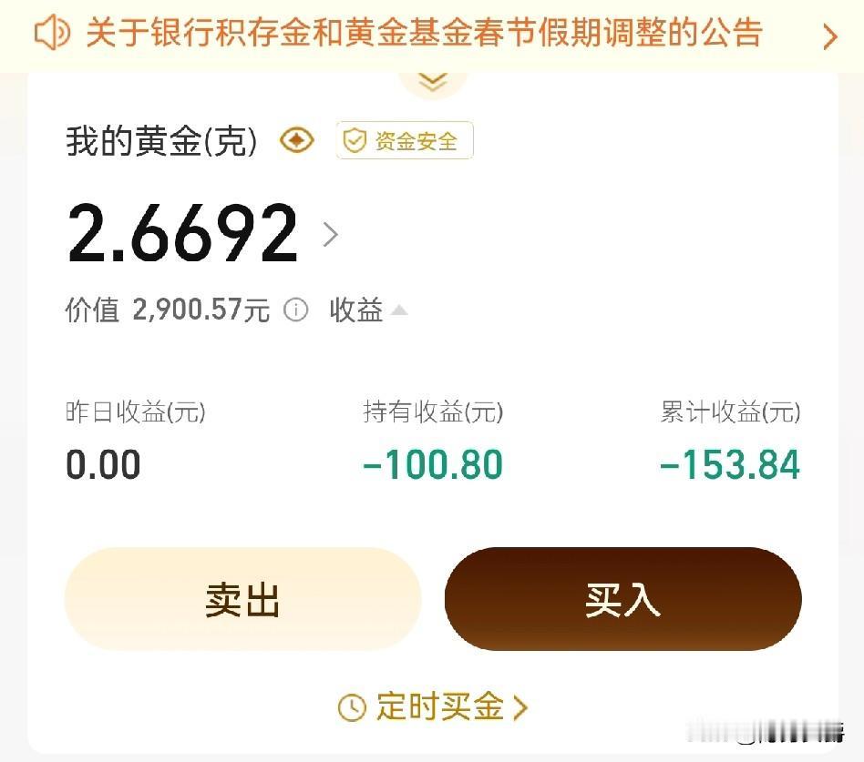 其实买黄金还是比较稳妥保值的, 别听网上铺天盖地的叫,什么黄金大跳水,韭菜,套牢,挂在树梢上。 我买了3000基金,纯属想玩一玩的体验金,还是在1130左右高点买入的,也属于挂在树梢上的。 但是黄金价格涨涨跌跌,经过几次大跳水,目前也就亏了100块而已。 春节休盘期间金价又微微上涨,目前来看,再过两天开盘基本回本。 其实黄金就是钱,总体趋势是上涨的。 想买随时都可以入手,但不要满仓,涨了卖点,跌了加点,不会像炒股一样让你跌个跳楼。