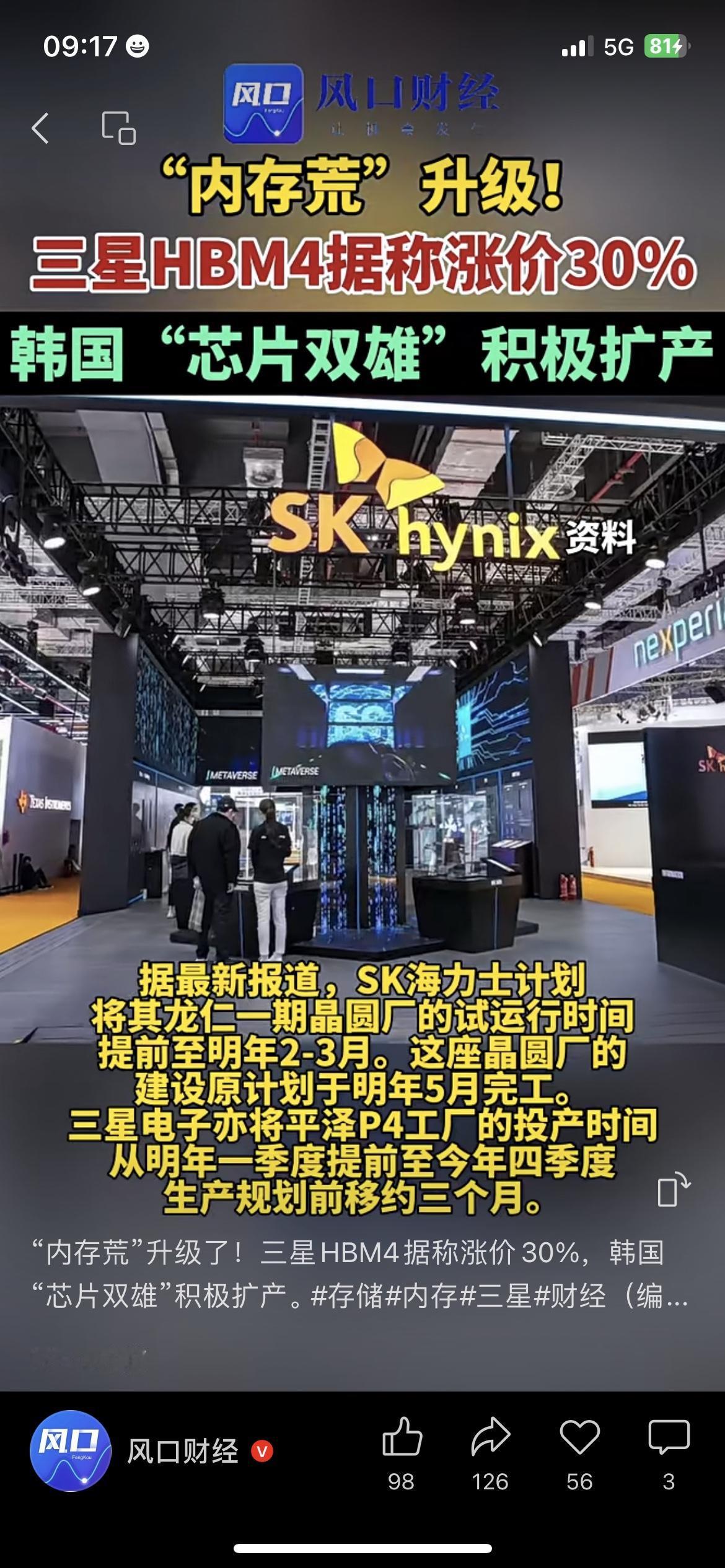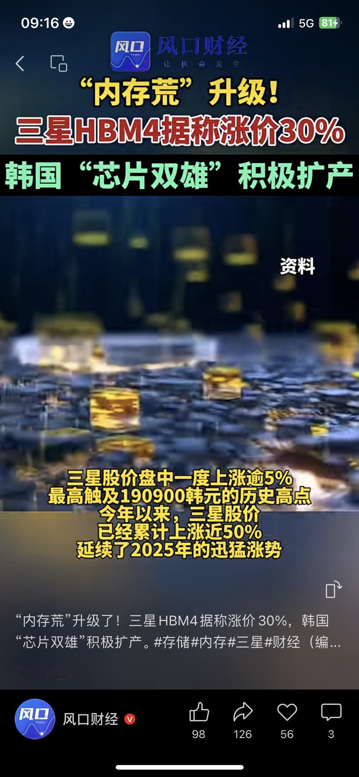 三星这波涨价,直接把“内存荒”推到了新高度: • HBM4芯片涨价30%,比上一代贵了近三分之一 • 股价盘中涨超5%,创历史新高,今年累计涨了近50% • SK海力士、三星都在提前扩产,龙仁厂、平泽厂都在赶工 说实话,这事儿跟咱普通人的钱袋子直接相关: • 买AI手机、AI PC的,价格会更贵 • 手里有芯片、存储基金的,短期会有波动 • 想入行的,芯片设计、制造、封测这些岗位会更吃香 记住:AI越火,芯片越贵,“卖水人”越赚。 ⚠️ 市场有风险,投资需谨慎。 三星HBM4 内存荒 芯片赛道