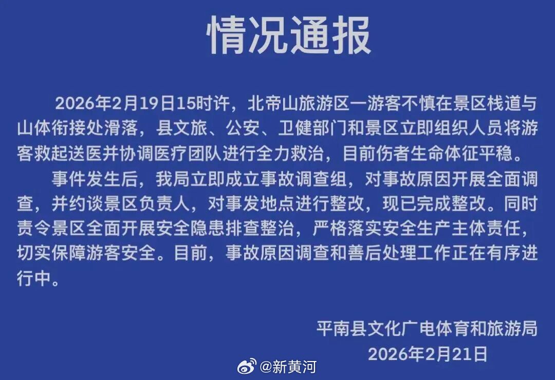 【#官方通报10岁男孩北帝山景区坠崖#:隐患已整改,伤者生命体征平稳】#男孩坠崖处缺口存在已有一年#2月21日,广西贵港平南县文化广电体育和旅游局发布情况通报:2026年2月19日15时许,北帝山旅游区一游客不慎在景区栈道与山体衔接处滑落,县文旅、公安、卫健部门和景区立即组织人员将游客救起送医并协调医疗团队进行全力救治,目前伤者生命体征平稳。