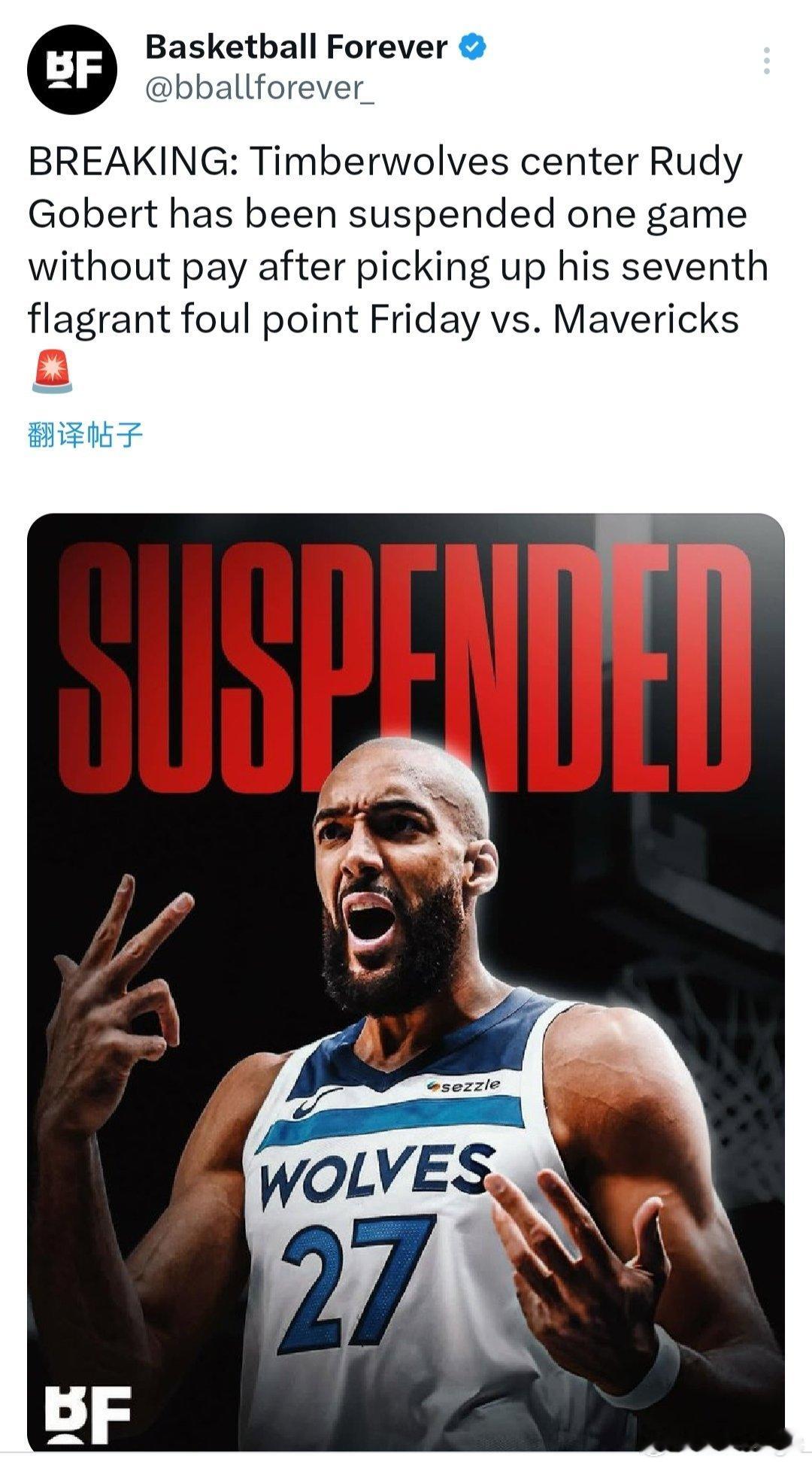 NBA官宣,戈贝尔因累计七次恶意犯规积分,将被停薪禁赛一场。