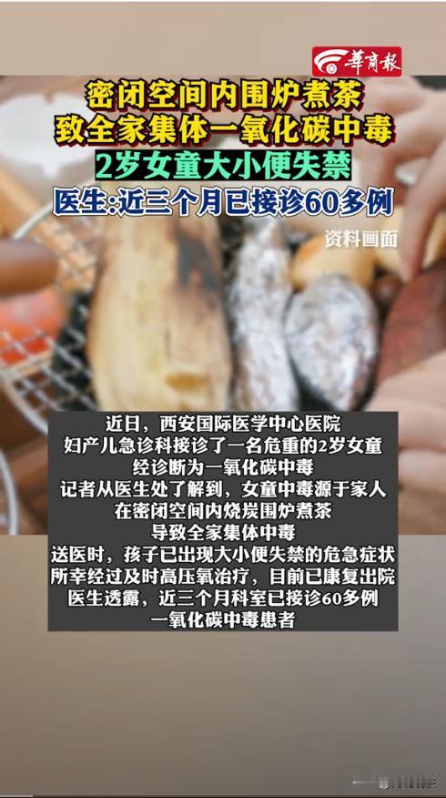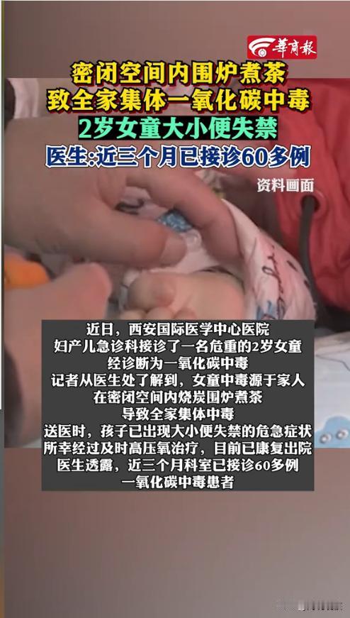 “悲剧还是发生了!”近日,陕西西安,一家人因天气寒冷,就在屋里进行围炉煮茶。却不料短短几小时就全部一氧化碳中毒!2岁女童更是陷入昏迷,送医院时,甚至出现大小便失禁的状态,情况十分危急!医生:三个月60多例了,围炉取暖千万别再紧闭门窗了! 围炉煮茶是当下流行的冬日休闲方式,在温暖的炉火旁喝茶聊天,看似充满诗意,却暗藏着致命风险。 据媒体2月3日报道,这天天气寒冷,一家人就在门窗紧闭的室内生起了炭炉。准备围炉煮茶,聊聊天。起初大家都沉浸在惬意的时光里,可没过多久,就陆续出现了头晕、恶心、四肢无力的症状。 一开始他们以为是没休息好,直到2岁的孩子昏迷不醒,并出现大小便失禁,家人才意识到不对劲,赶紧拨打了120。 送医后,医生诊断为急性一氧化碳中毒,而且孩子中毒情况较为严重,可能有生命危险。 据接诊医生透露,近三个月来,他们已经收治了60多例类似的患者。医生特别强调,一氧化碳中毒最凶险的是“延迟爆炸”效应,即使初期症状缓解,也可能在几天后突然出现严重的并发症。 医生提醒大家,享受围炉煮茶、炭火取暖时,一定要保持室内通风,最好能安装一氧化碳报警器,避免悲剧发生。 信息来源:《密闭空间内围炉煮茶致全家集体 氧化碳中毒,2岁女童大小便失禁》华商报