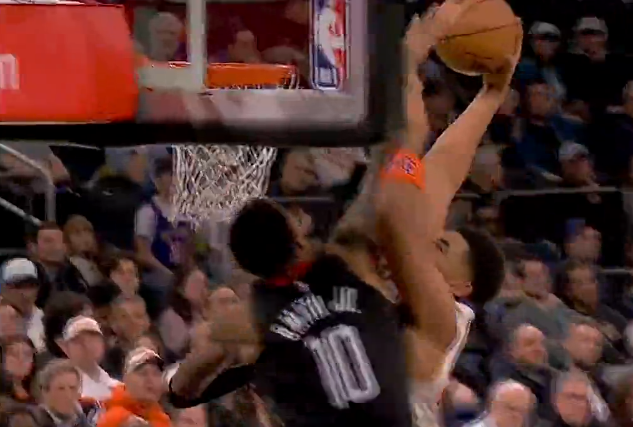 第四节比赛中,唐斯接球起飞砸扣贾巴里,尼克斯末节80-93落后火箭。