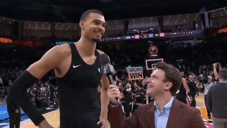 赛后,文班在场边接受了记者采访,被记者问到了比赛中的一个拉杆双手暴扣,文班表示: