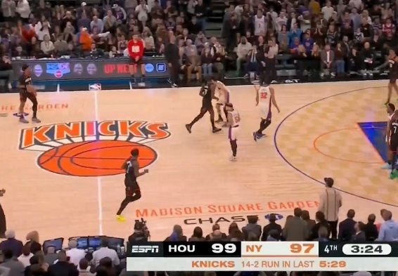 第四节比赛中,唐斯15中10已经砍下25分,尼克斯轰出一波14-2仅落后火箭2分。