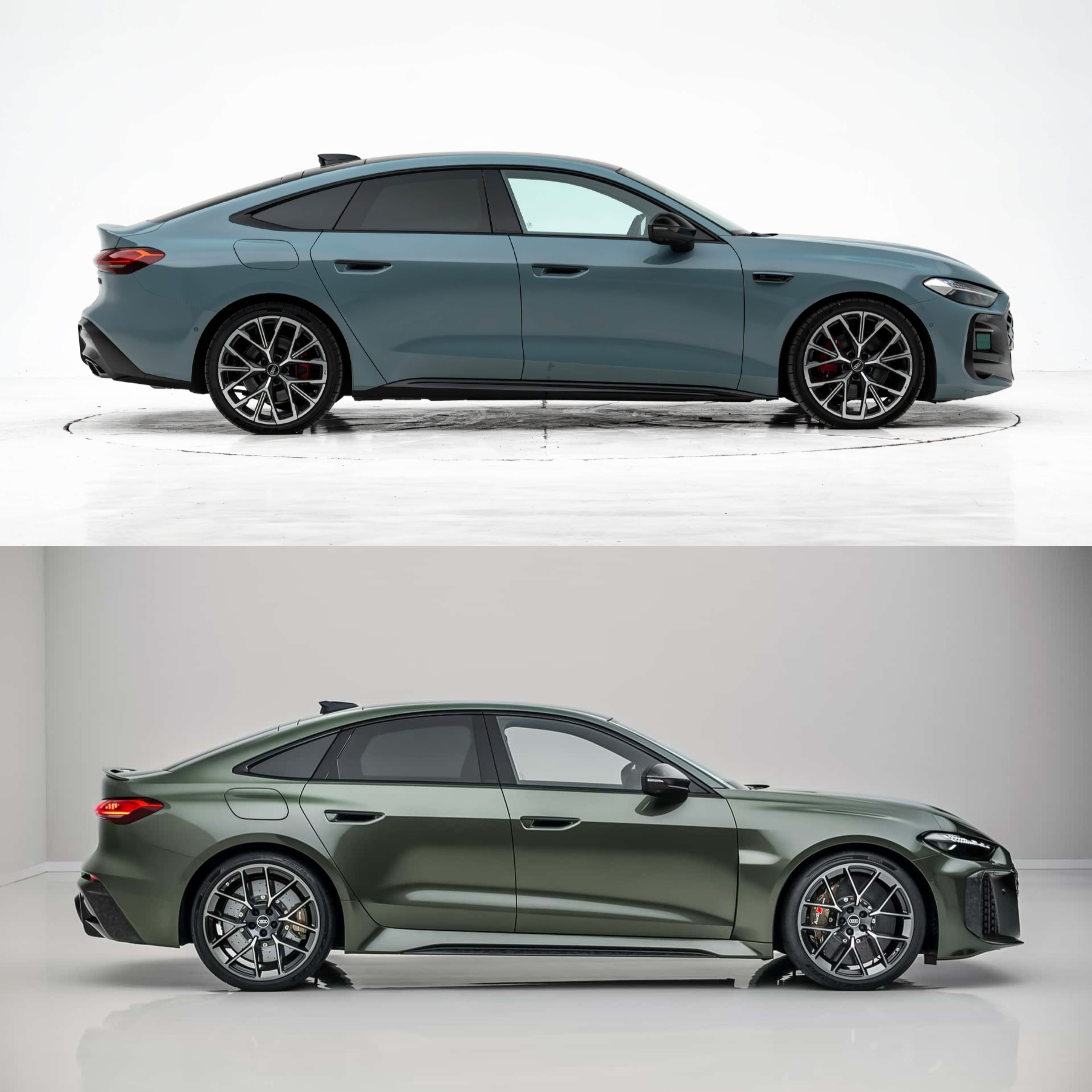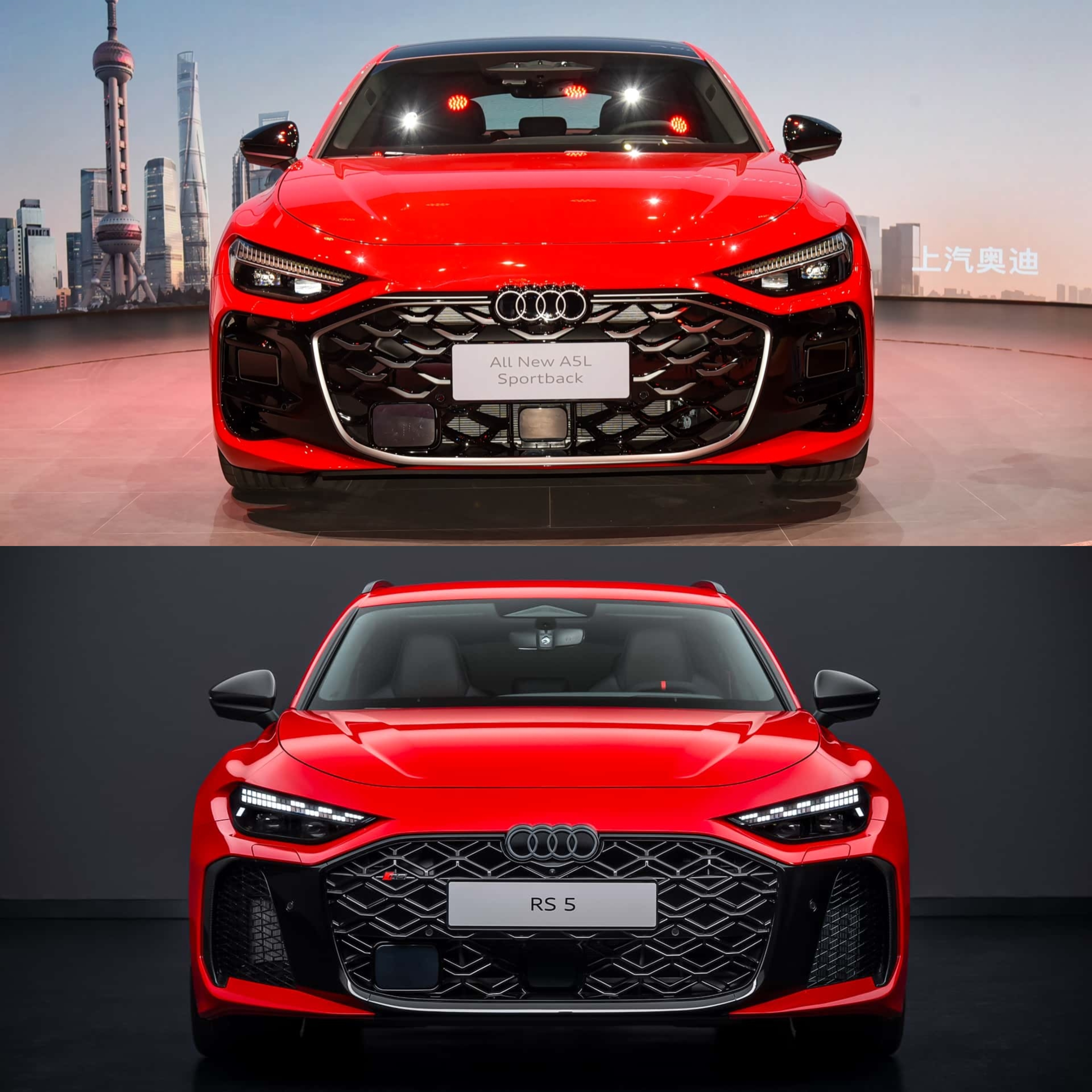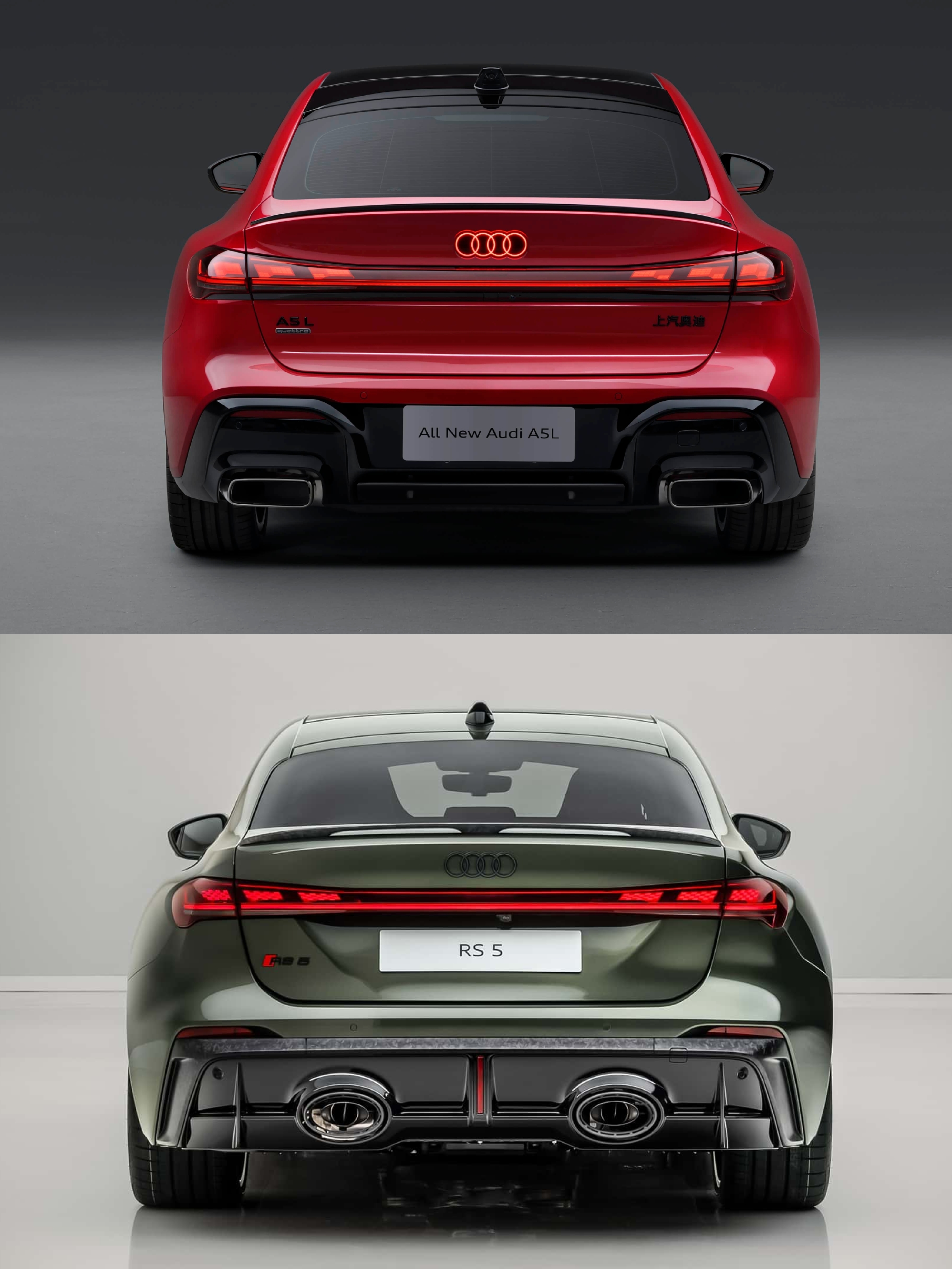 上汽奥迪A5L Sportback VS 奥迪RS5。二者前脸造型设计差异不大,尾部设计各有千秋。不过上汽奥迪A5L可以说是平价版的RS5,它并没有过度加长轴距,极大程度上保留了原版A5车型的操控水准。侧面的比例协调,甚至比RS5的短尾设计更加惊艳。