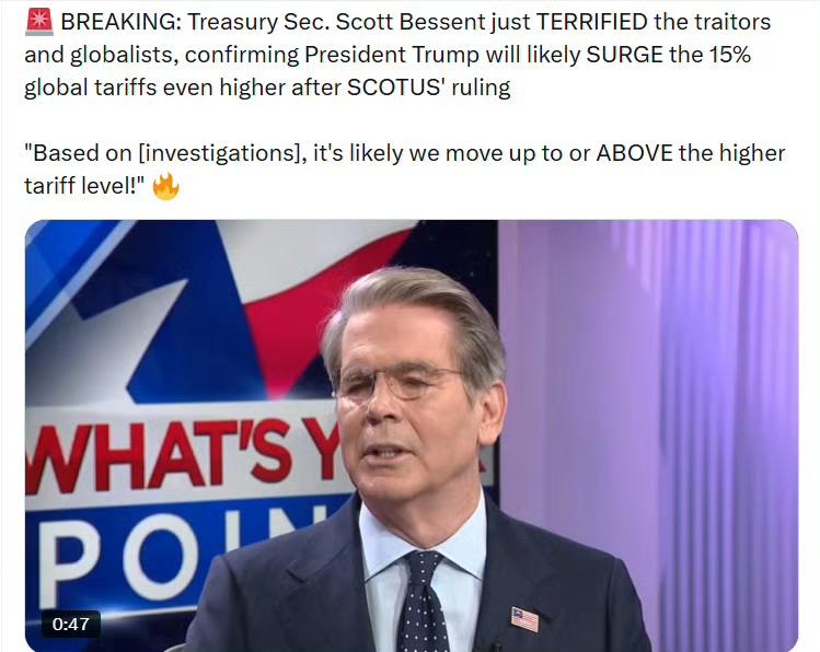 美国财政部长斯科特·贝森特表示,特朗普很可能会把15%的全球关税进一步大幅上调。