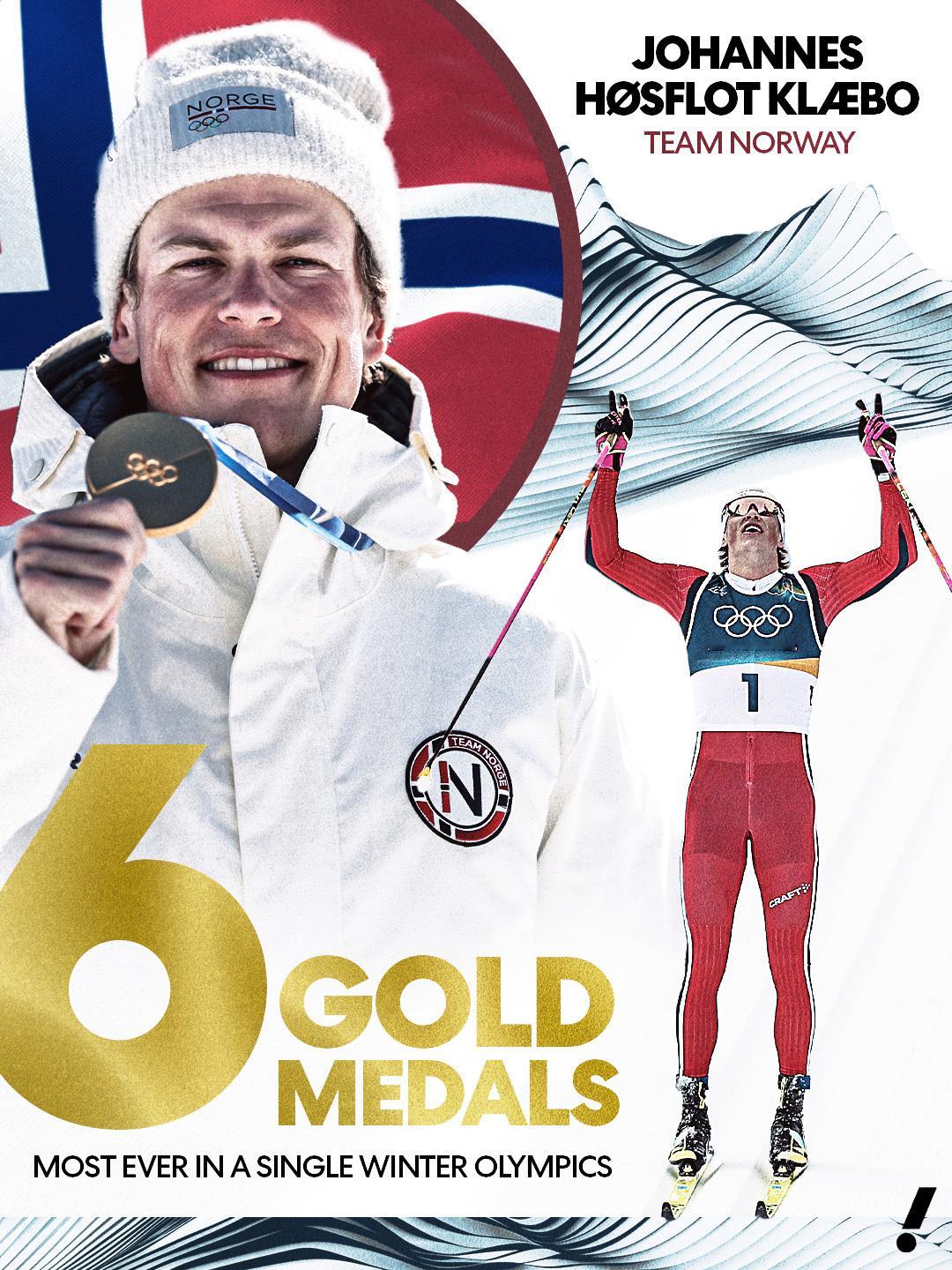 挪威男子越野滑雪选手约翰尼斯·克莱博今天拿到了他个人米兰-科尔蒂纳冬奥会的第6枚金牌,创造单届冬奥会金牌数历史纪录!这也是他生涯第11枚冬奥金牌,在奥运金牌榜上仅次于23金的菲尔普斯。冬奥会单届冬奥会6金此刻皆不凡