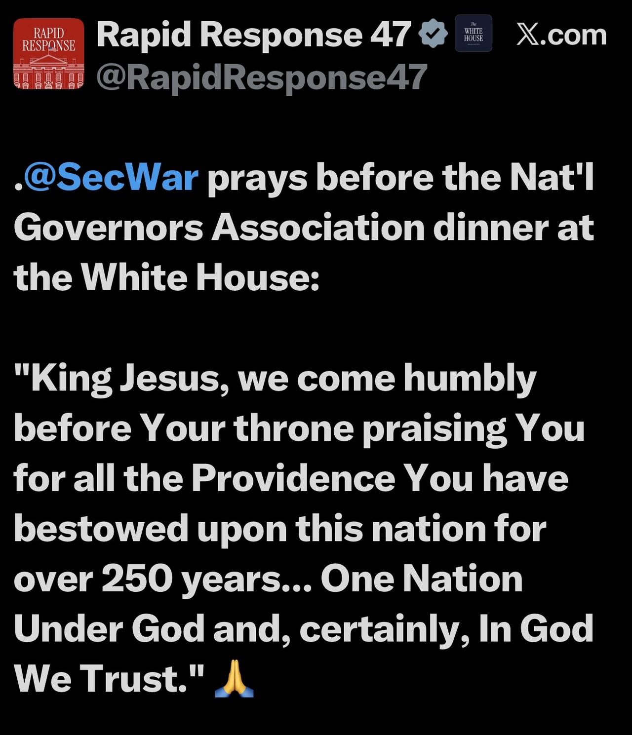 美国战争部部长赫格塞斯在白宫举行的全国州长协会晚宴前祈祷: “耶稣君王,我们谦卑地来到您的宝座前,赞美您250多年来赐予这个国家的一切恩典……一个在上帝之下的国家,当然,我们信赖上帝。” 🙏