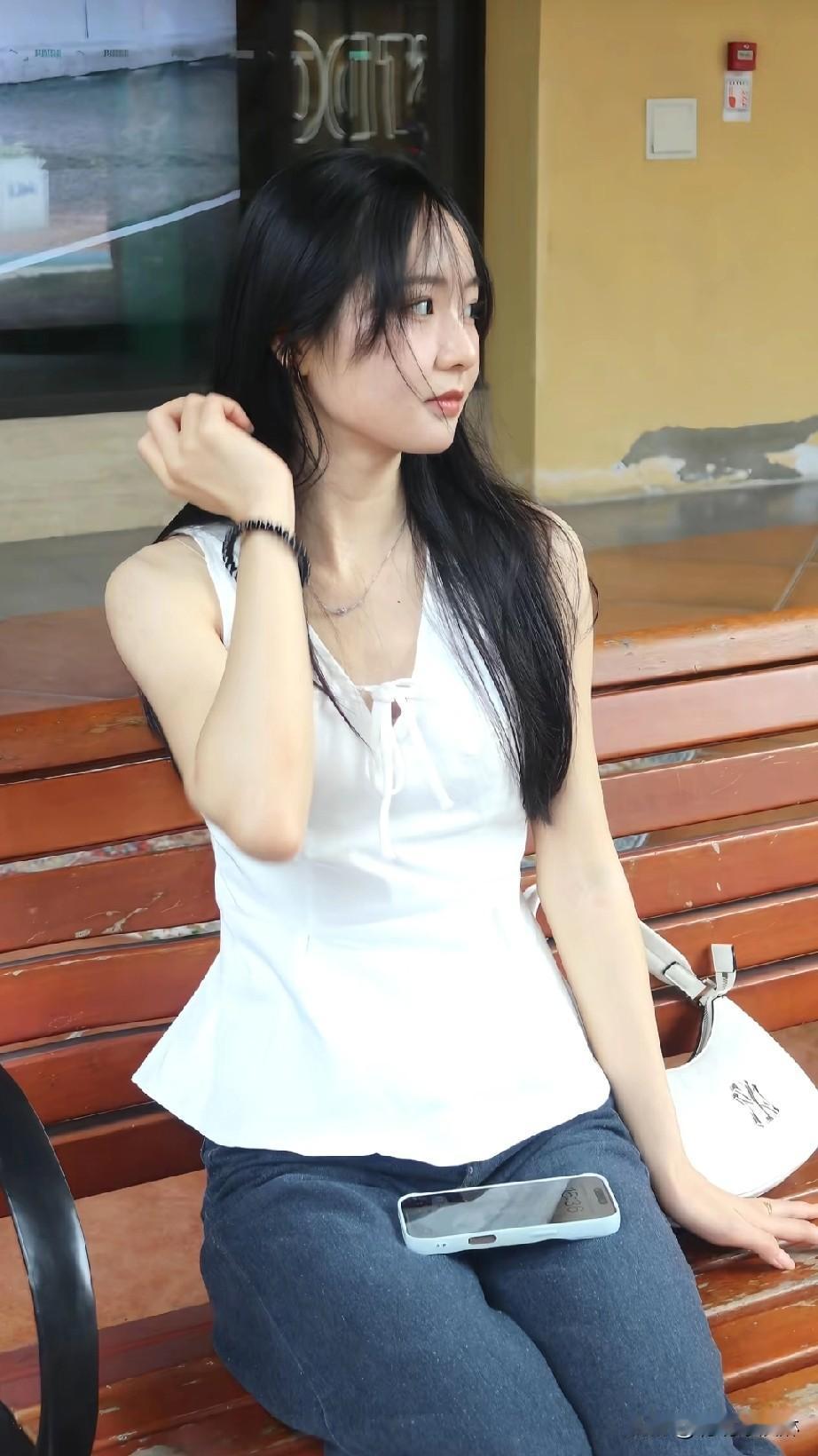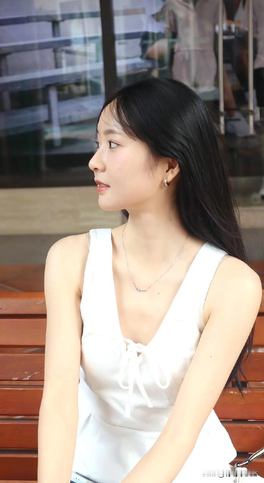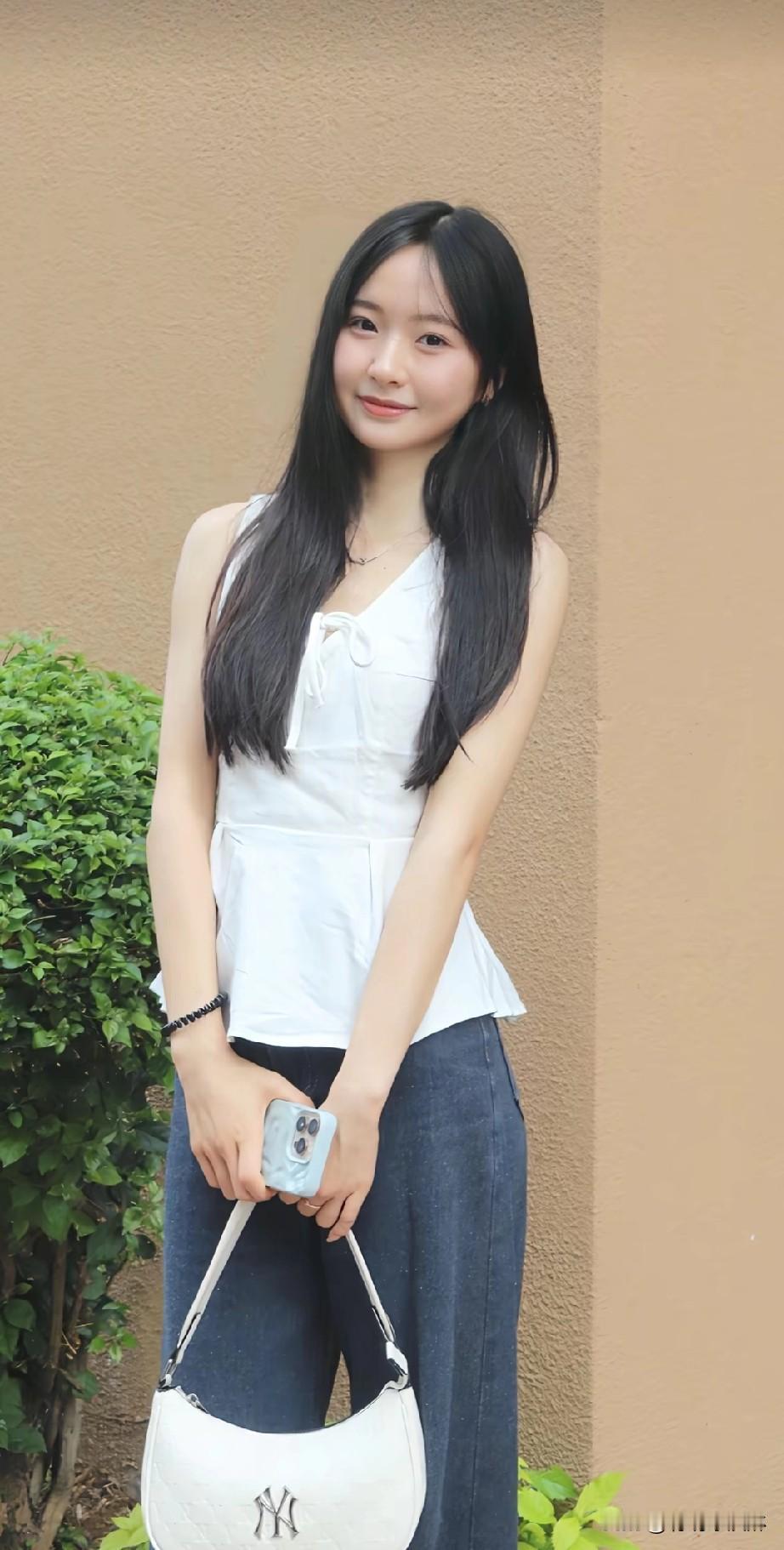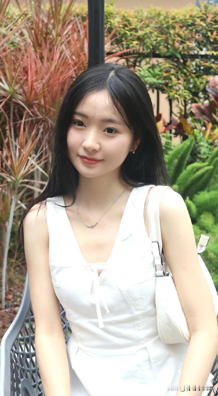 夏日清新穿搭,白色连衣裙与绿植相映成趣,轻松惬意。