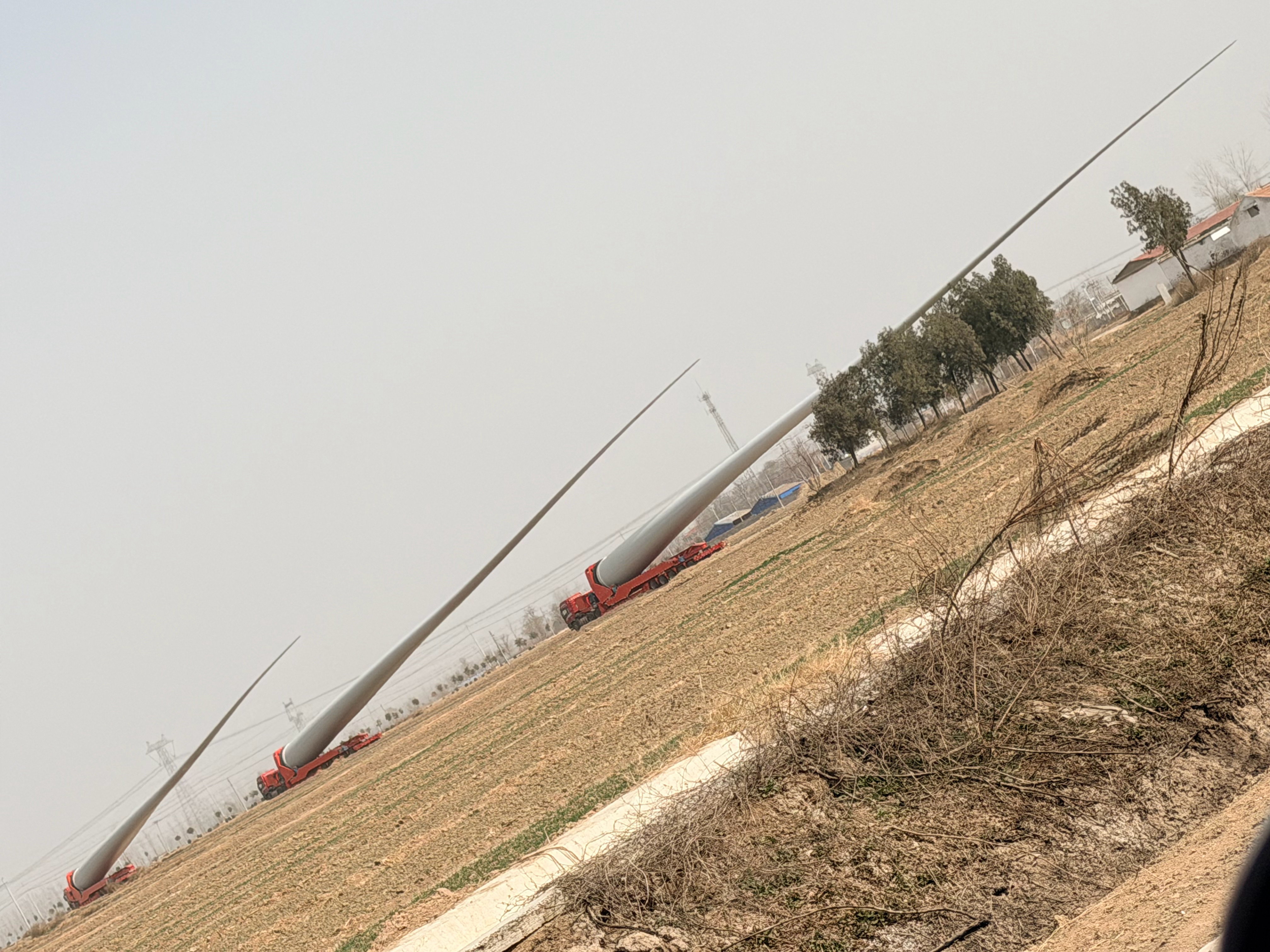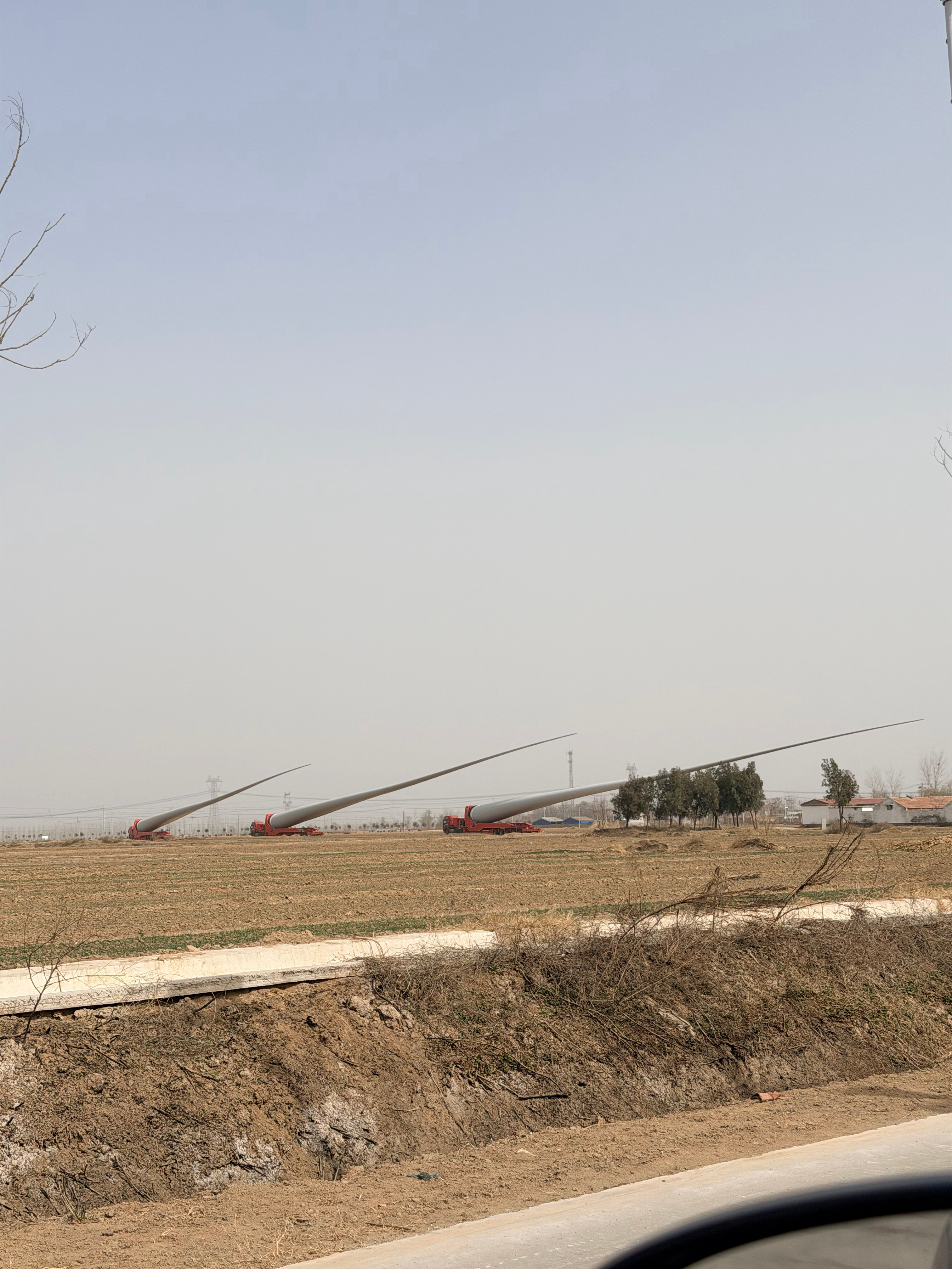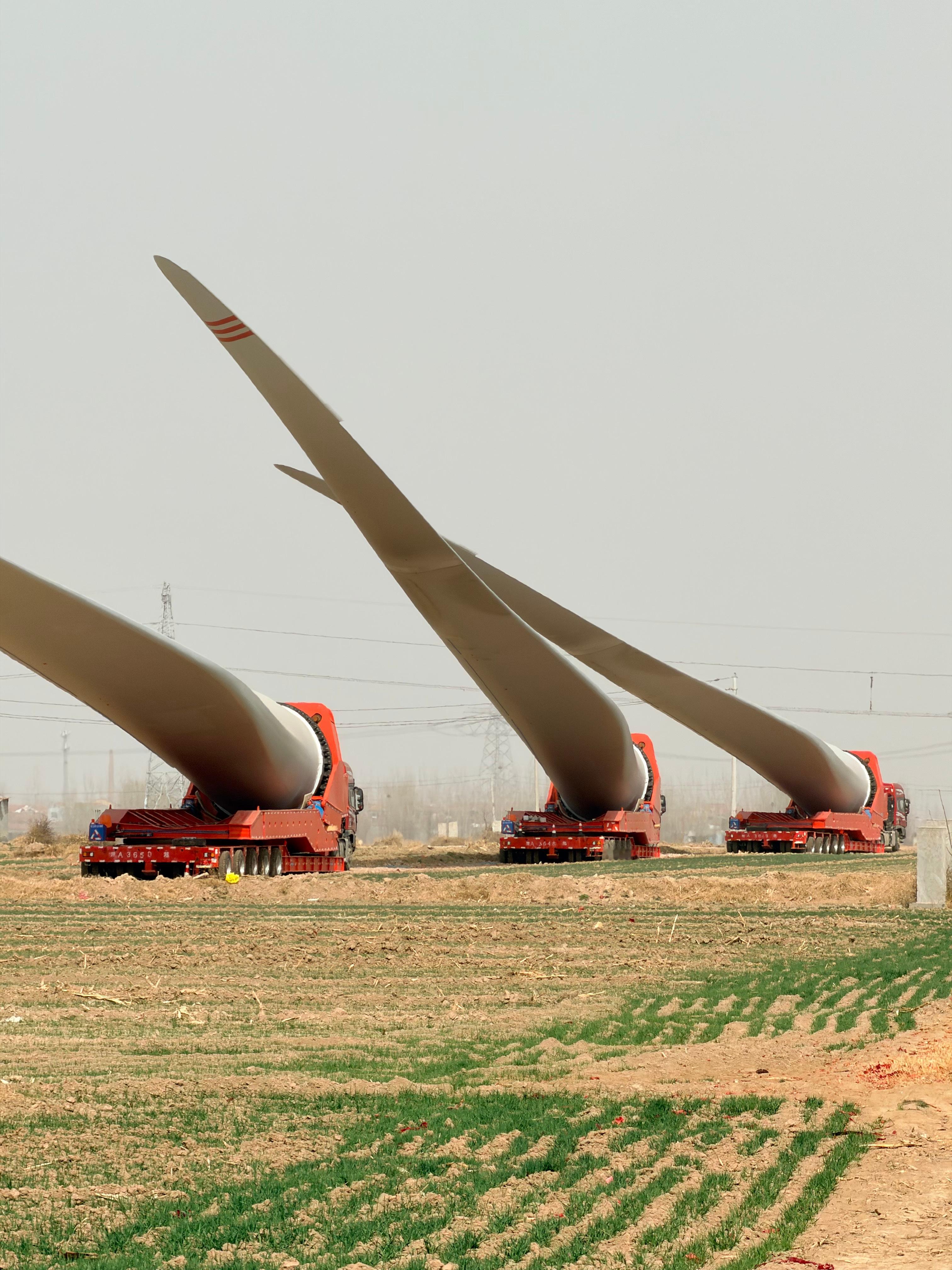 路窄了真不行啊!像这种风力发电的风扇叶,因为路上过不去,只能先临时放在这了“要想