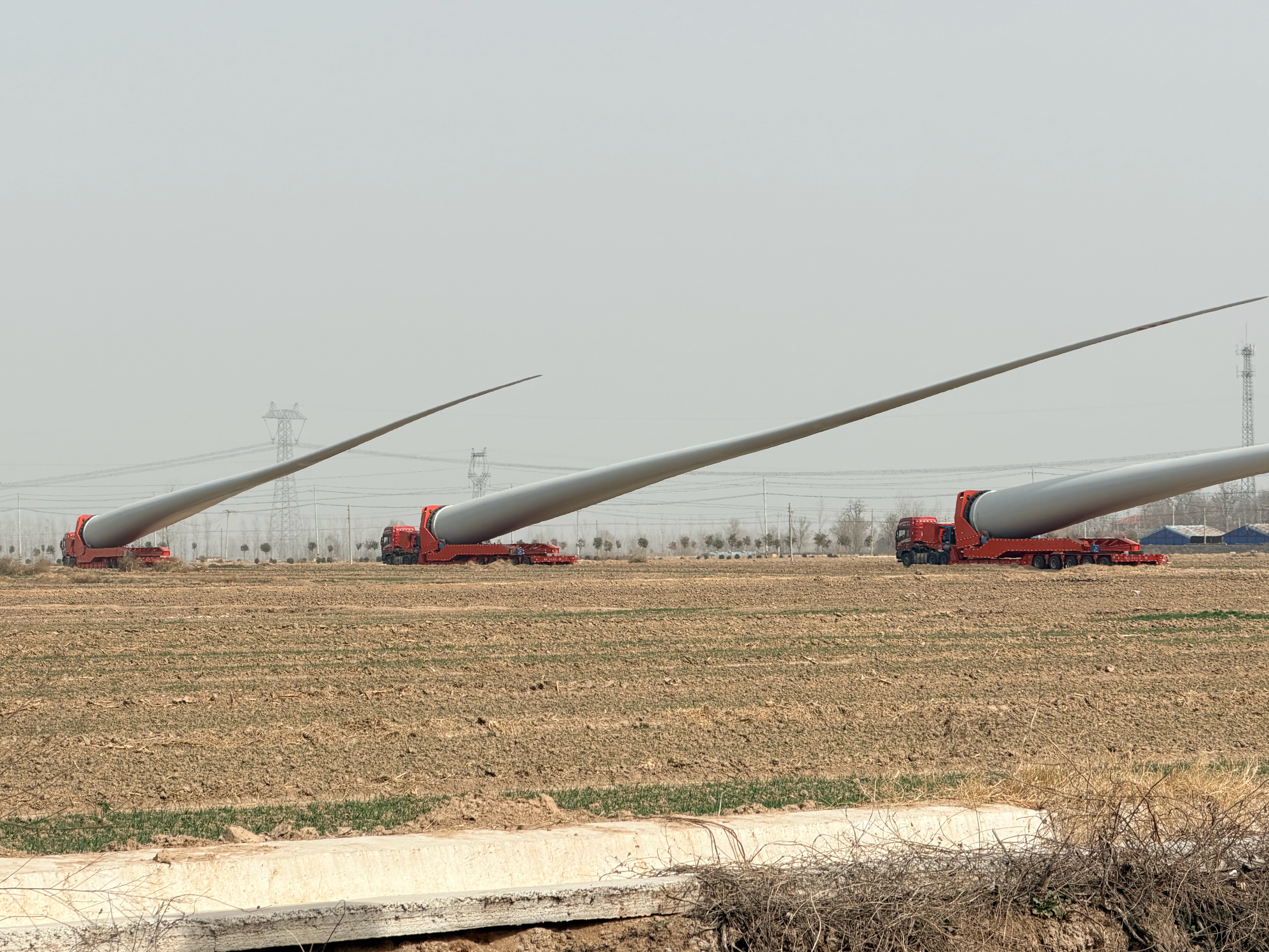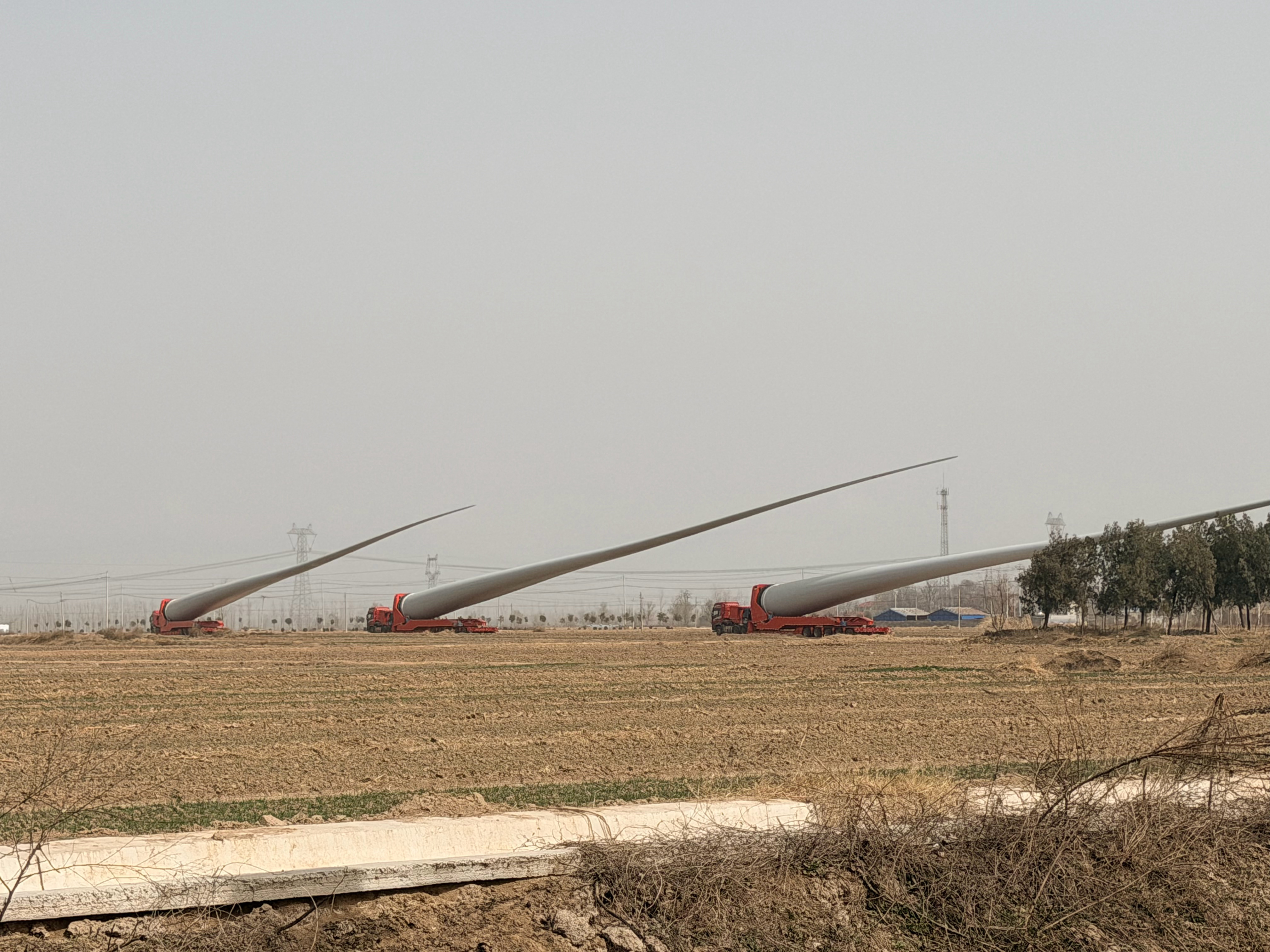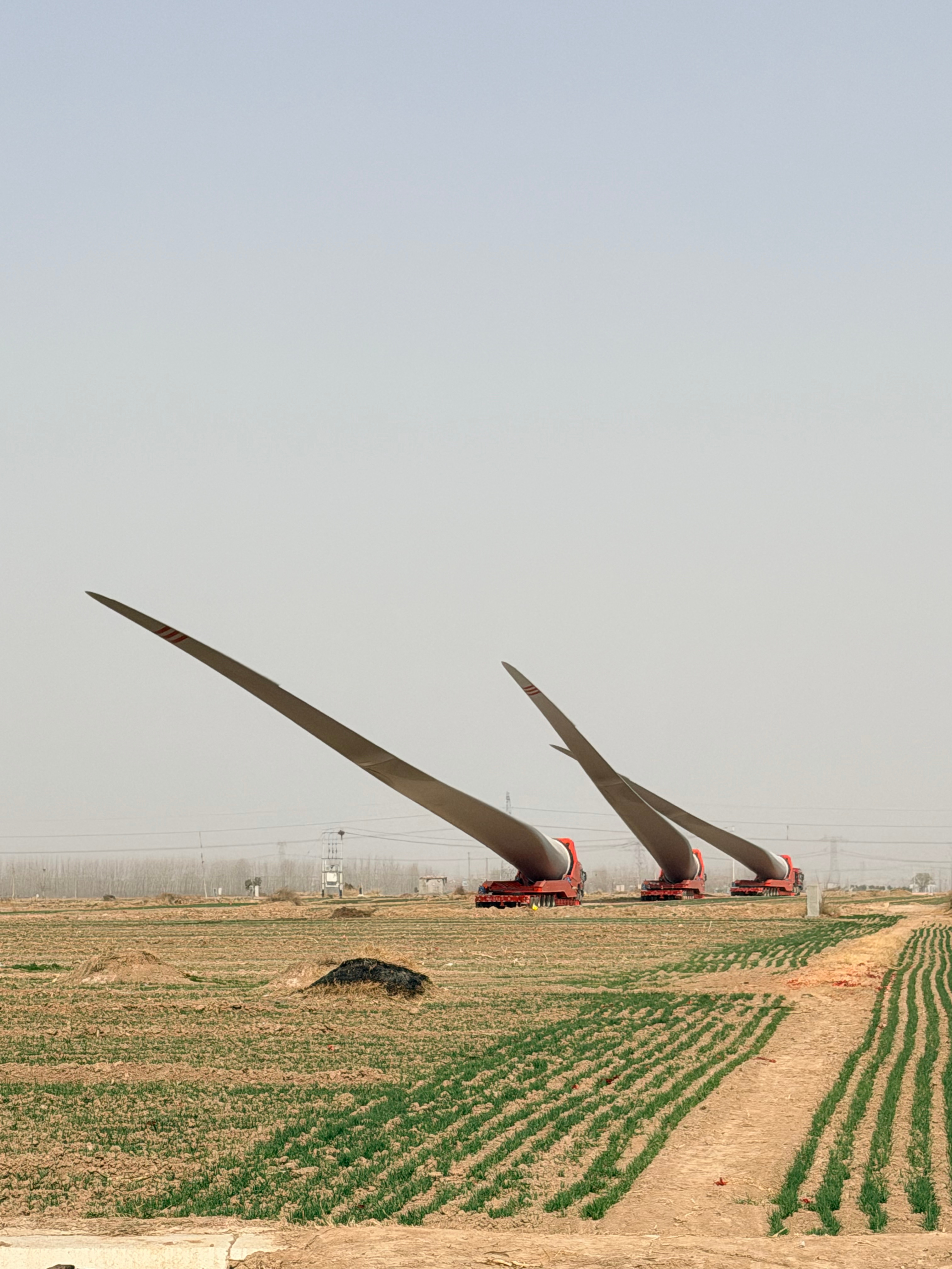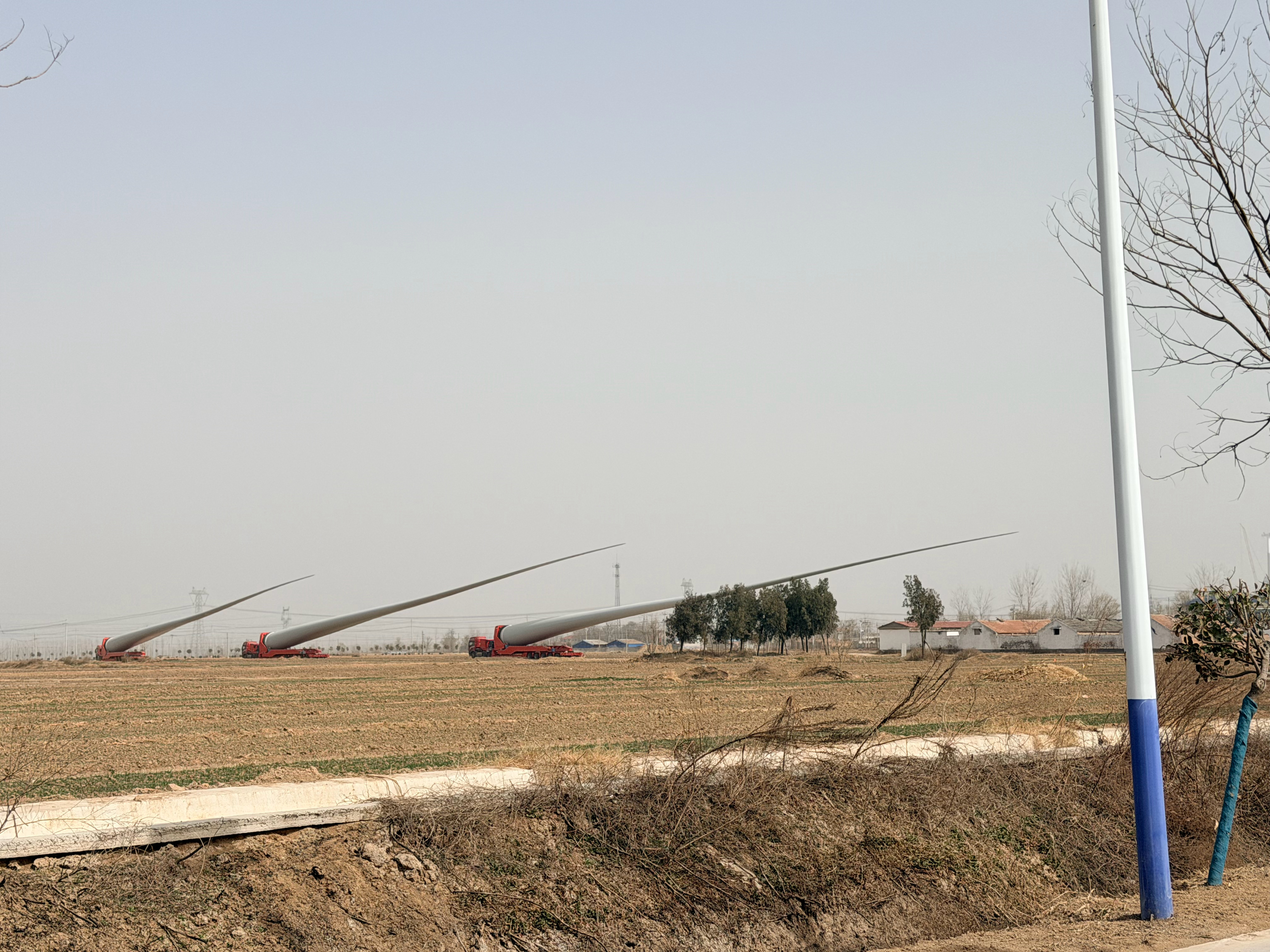 路窄了真不行啊!像这种风力发电的风扇叶,因为路上过不去,只能先临时放在这了“要想
