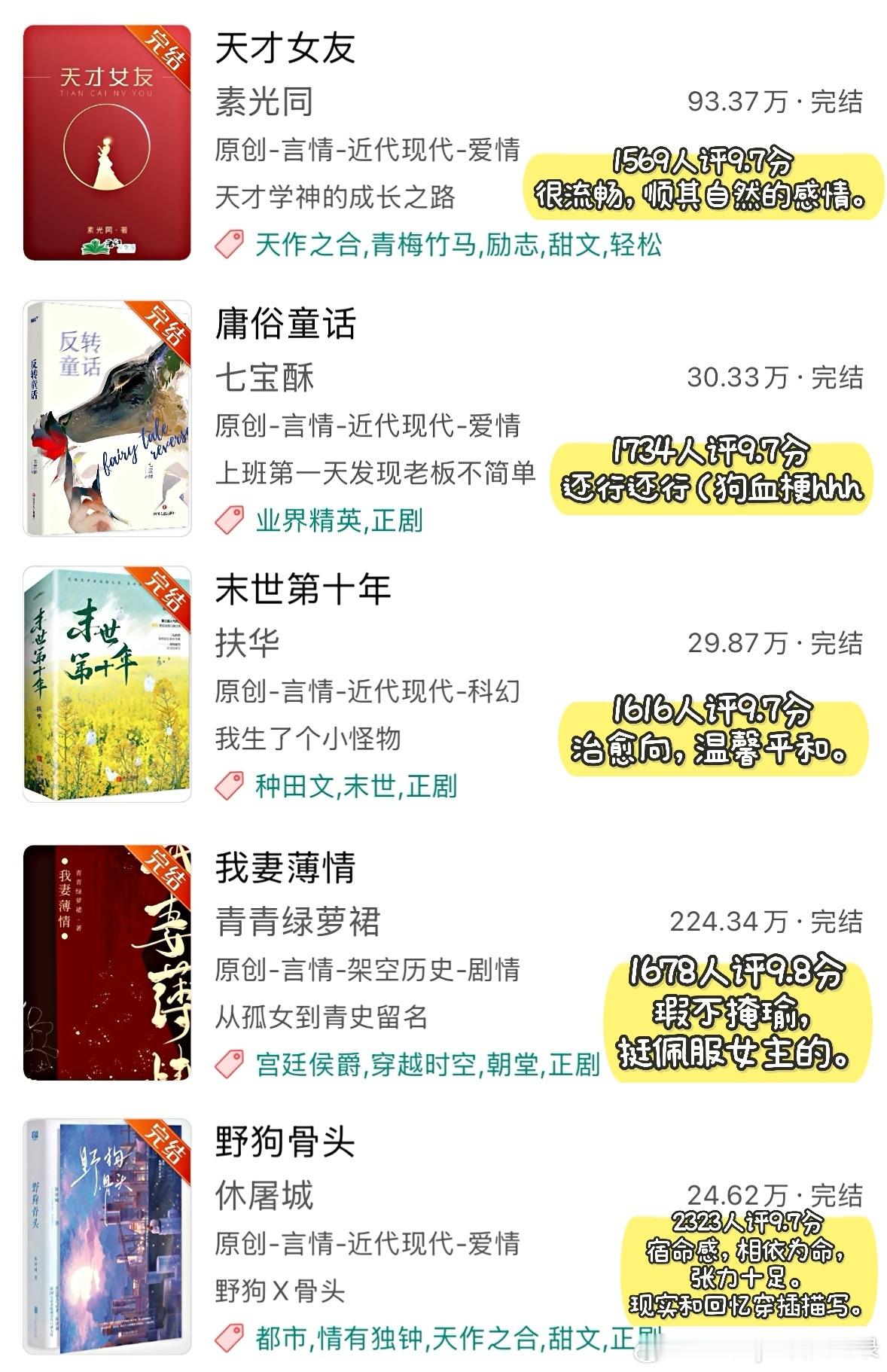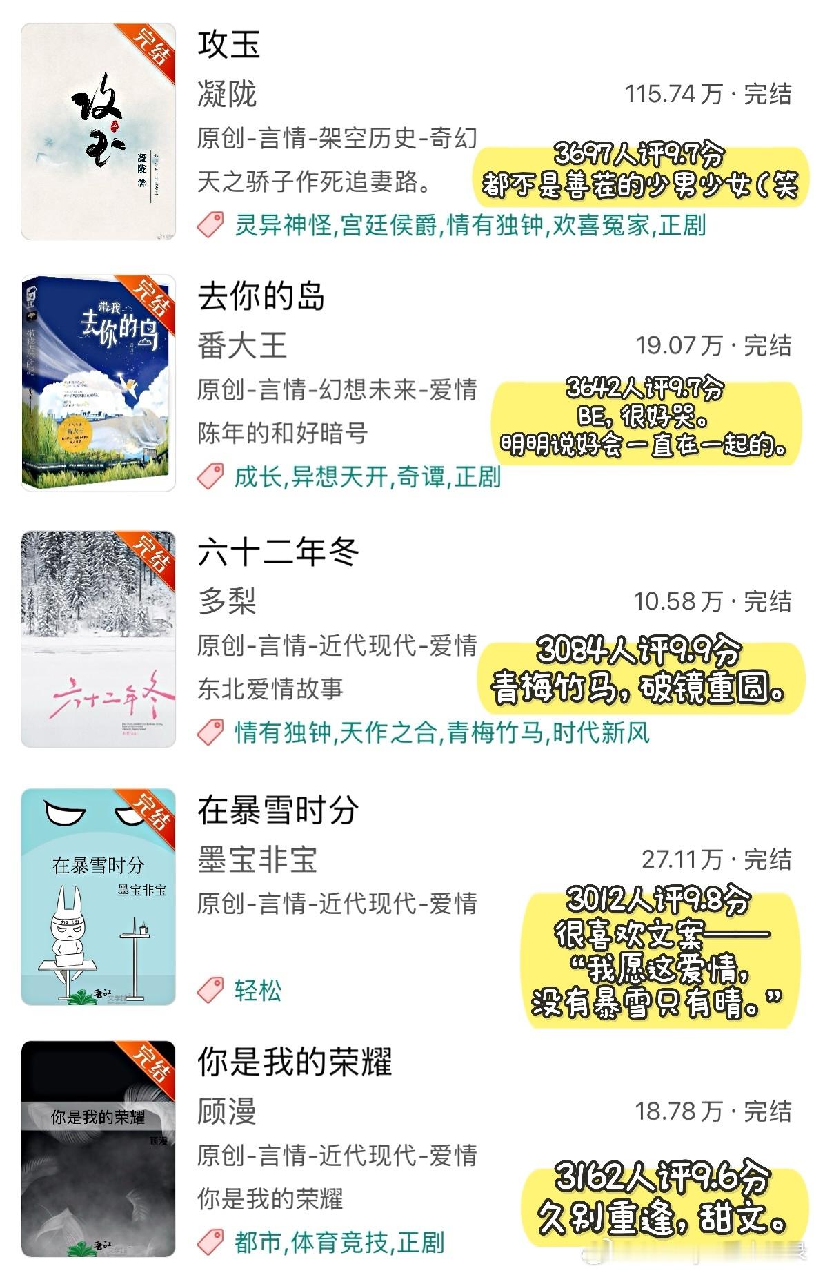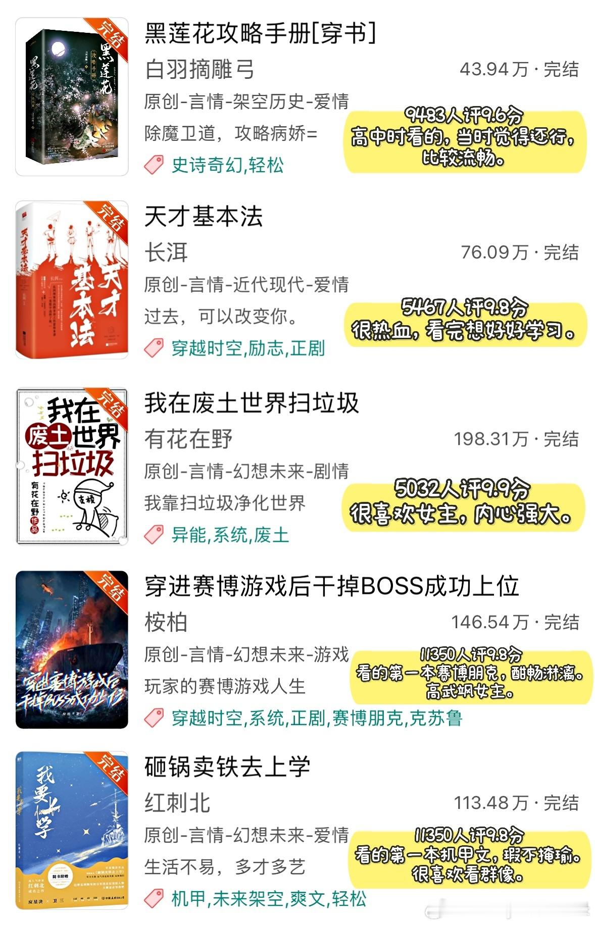 ◽️ 只是从高评分文里筛选我看过的小说,图片里的文并非全部都作推荐。这些小说几乎都有十万收藏以上,有些文虽然有几百人评分且达到9.9/10分,但并未放入其中,不过它们确实很好看!(详见Top100小说那期书单)◽️ 提到的小说:1. 《黑莲花攻略手册》白羽摘雕弓2. 《天才基本法》长洱3. 《我在废土世界扫垃圾》有花在野4. 《穿进赛博游戏后干掉BOSS成功上位》桉柏5. 《砸锅卖铁去上学》红刺北6. 《向师祖献上咸鱼》扶华7. 《见春天》纵虎嗅花|BE8. 《当我在地铁上误连别人的手机蓝牙后》七宝酥9. 《小船三年又三年》二八杠10. 《月明千里》罗青梅11. 《十二年,故人戏》墨宝非宝12. 《坤宁》时镜13. 《攻略不下来的男人》袖侧14. 《五十年代jūn工大院》鹿子草15. 《长安第一美人》发达的泪腺16. 《深情眼》耳东兔子17. 《寄生之子》群星观测|无CP18. 《姜姬》多木木多19. 《桥头楼上》priest|无CP20. 《恰逢雨连天》沉筱之21. 《攻玉》凝陇22. 《去你的岛》番大王|BE23. 《六十二年冬》多梨24. 《在暴雪时分》墨宝非宝25. 《你是我的荣耀》顾漫26. 《不醒》一度君华27. 《长安小饭馆》樱桃糕28. 《维持女配的尊严》淅和29. 《有匪》priest30. 《无污染、无公害》priest31. 《怨.气撞铃》尾鱼32. 《金山蝴蝶》唯刀百辟33. 《老实人,但玛丽苏》叫我苏三少34. 《第一战场指挥官!》退戈35. 《今天巴黎有雨》核萄36. 《财神春花》戈鞅37. 《早安!三国打工人》蒿里茫茫38. 《梦河夜航》严雪芥39. 《无何有乡》Twentine40. 《龙骨焚箱》尾鱼41. 《野狗骨头》休屠城42. 《我妻薄情》青青绿萝裙43. 《末.世第十年》扶华44. 《庸俗童话》七宝酥45. 《天才女友》素光同♦️ 欢迎补充~言情小说推荐热门小说推荐推文