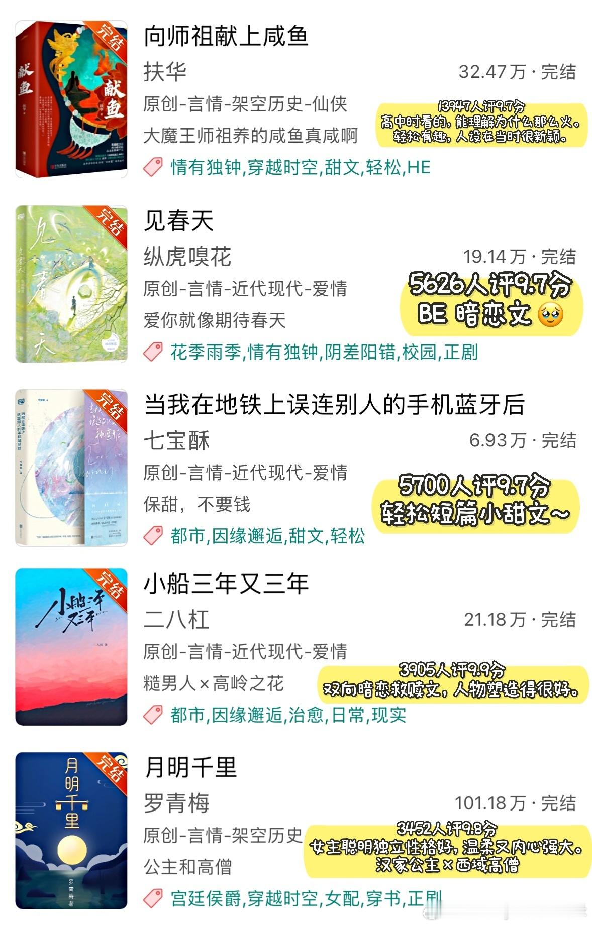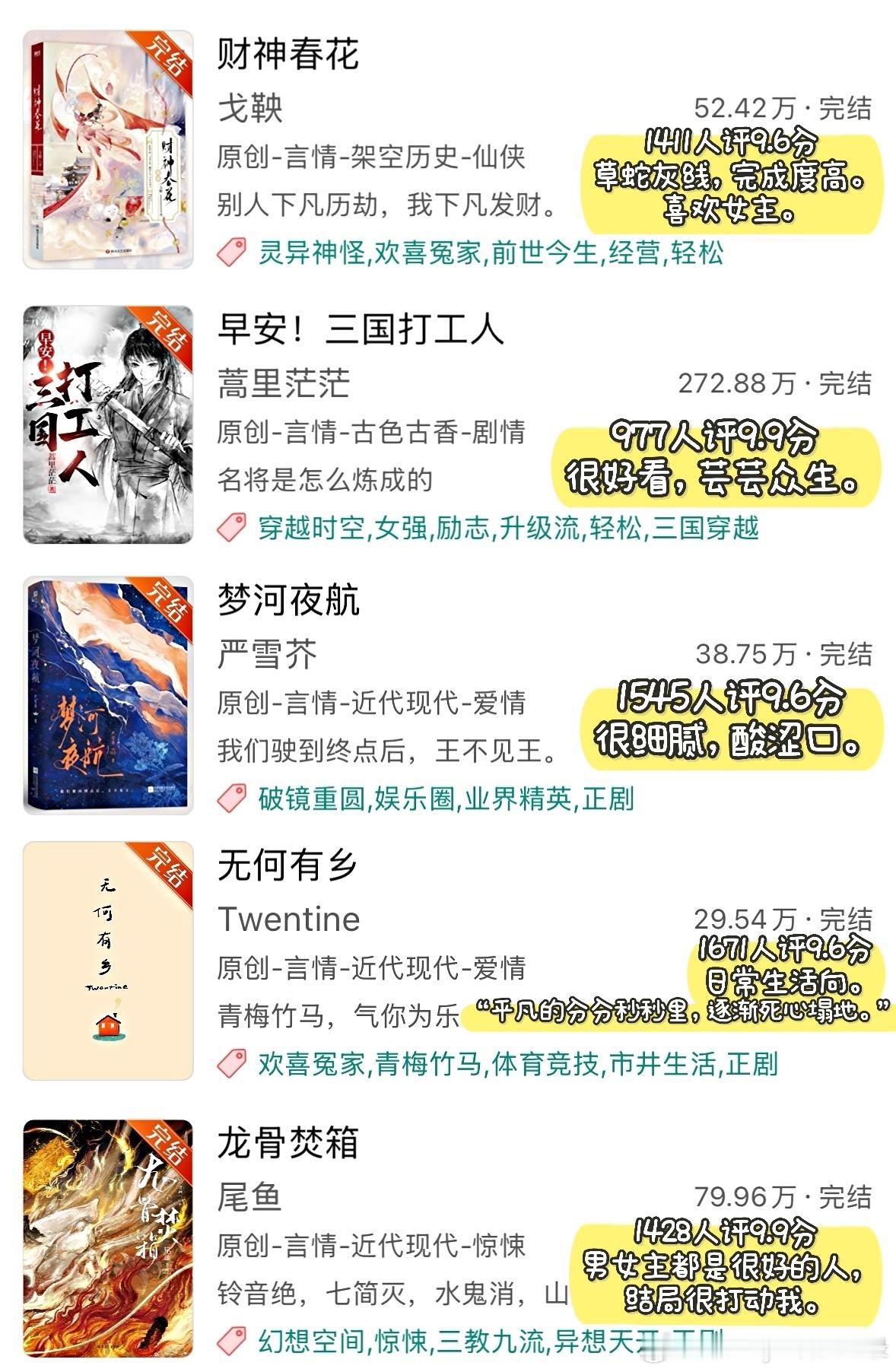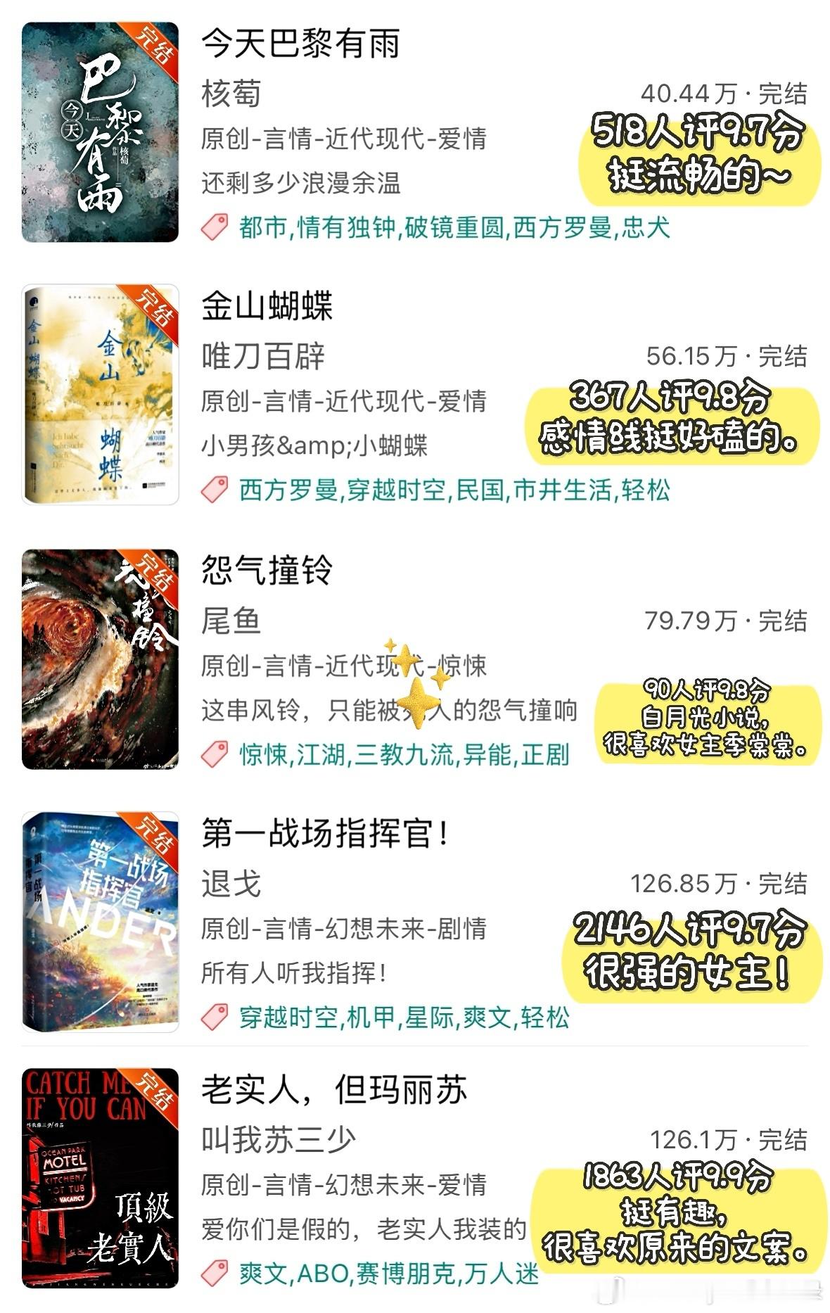 ◽️ 只是从高评分文里筛选我看过的小说,图片里的文并非全部都作推荐。这些小说几乎都有十万收藏以上,有些文虽然有几百人评分且达到9.9/10分,但并未放入其中,不过它们确实很好看!(详见Top100小说那期书单)◽️ 提到的小说:1. 《黑莲花攻略手册》白羽摘雕弓2. 《天才基本法》长洱3. 《我在废土世界扫垃圾》有花在野4. 《穿进赛博游戏后干掉BOSS成功上位》桉柏5. 《砸锅卖铁去上学》红刺北6. 《向师祖献上咸鱼》扶华7. 《见春天》纵虎嗅花|BE8. 《当我在地铁上误连别人的手机蓝牙后》七宝酥9. 《小船三年又三年》二八杠10. 《月明千里》罗青梅11. 《十二年,故人戏》墨宝非宝12. 《坤宁》时镜13. 《攻略不下来的男人》袖侧14. 《五十年代jūn工大院》鹿子草15. 《长安第一美人》发达的泪腺16. 《深情眼》耳东兔子17. 《寄生之子》群星观测|无CP18. 《姜姬》多木木多19. 《桥头楼上》priest|无CP20. 《恰逢雨连天》沉筱之21. 《攻玉》凝陇22. 《去你的岛》番大王|BE23. 《六十二年冬》多梨24. 《在暴雪时分》墨宝非宝25. 《你是我的荣耀》顾漫26. 《不醒》一度君华27. 《长安小饭馆》樱桃糕28. 《维持女配的尊严》淅和29. 《有匪》priest30. 《无污染、无公害》priest31. 《怨.气撞铃》尾鱼32. 《金山蝴蝶》唯刀百辟33. 《老实人,但玛丽苏》叫我苏三少34. 《第一战场指挥官!》退戈35. 《今天巴黎有雨》核萄36. 《财神春花》戈鞅37. 《早安!三国打工人》蒿里茫茫38. 《梦河夜航》严雪芥39. 《无何有乡》Twentine40. 《龙骨焚箱》尾鱼41. 《野狗骨头》休屠城42. 《我妻薄情》青青绿萝裙43. 《末.世第十年》扶华44. 《庸俗童话》七宝酥45. 《天才女友》素光同♦️ 欢迎补充~言情小说推荐热门小说推荐推文