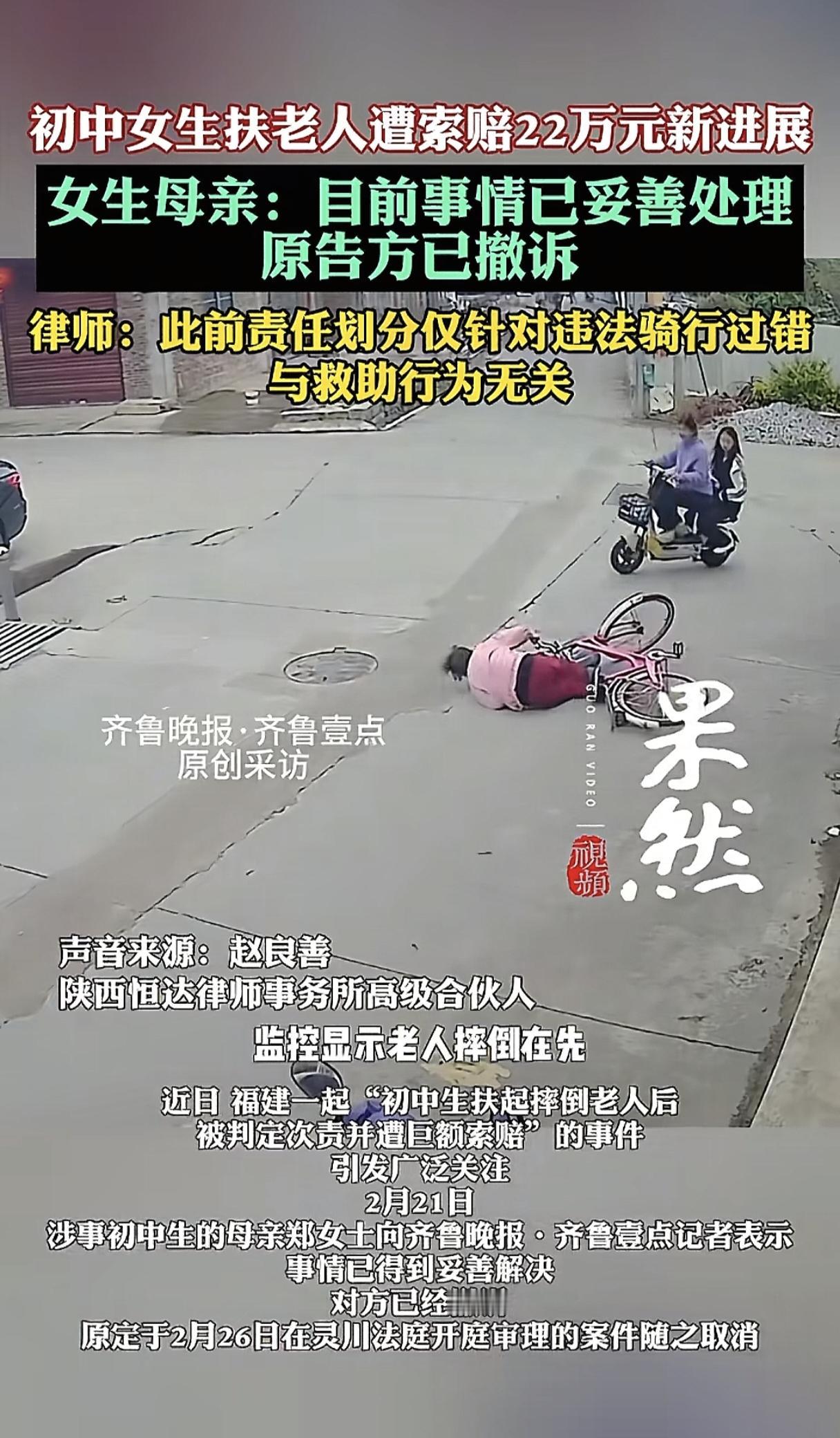 此前2名初中生扶老太遭索赔22万最新进展,对方已撤诉,双方达成和解!女孩妈妈说:“因为孩子快要开学了,担心孩子承受不住,怕学习受到影响,肯定要尽快解决。” 女孩妈妈说,因为事情都处理好了,就不想再发酵了,所以把相关视频都删除了,以免大家继续关注,浪费公共资源。 本来案件是定于2月26日开庭的,目前原告已撤诉,双方达成和解。 被问到当初交警定次责的依据是什么时,女孩妈妈说:“事情已经处理好,就不想再多说了。” 如果不是新闻上了热搜,估计原告也不会撤诉,老太住院12天花了两万多,说摔倒是被女孩吓的,要求女孩赔偿22万多,也真是敢狮子大开口啊! 女孩被交警判次责,估计行驶过程中多少有点违规,通过这个新闻,也提醒我们,不管是开的啥车,都要严格遵守交通规则,这也是在保护我们自己的合法权益。 事情虽然结束,但给女孩心理造成的伤害却不知何时才能散去,希望大家都能遵守规则,平安出行!