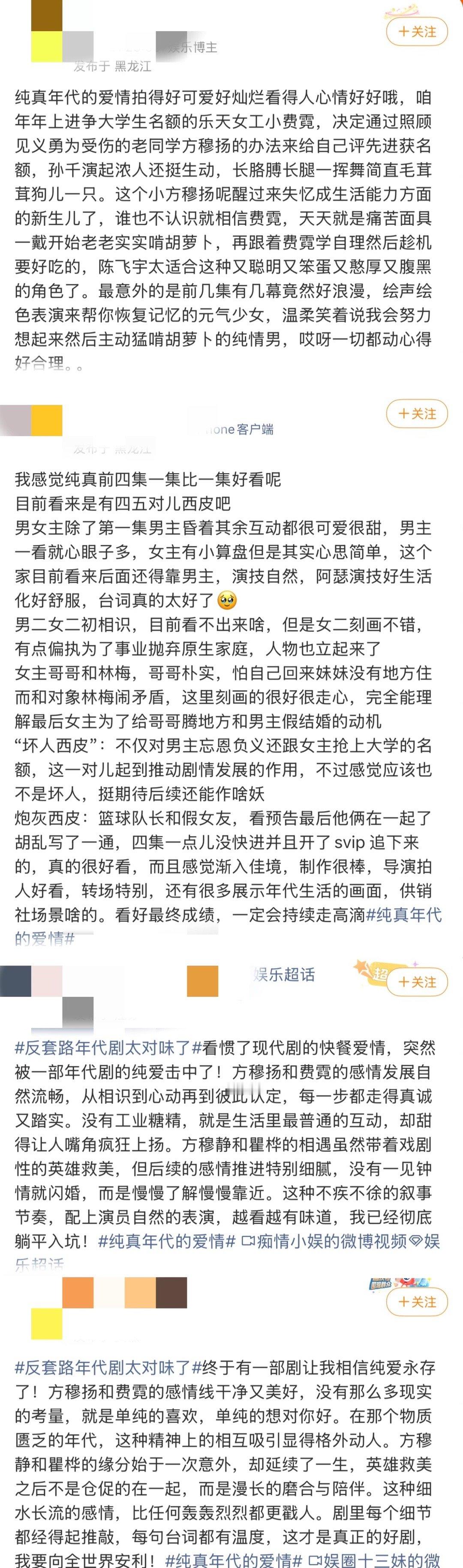 我的评分:陈飞宇孙千新剧首播口碑 首播口碑真的稳了!剧情节奏舒服,人物鲜活不悬浮,服化道高度还原年代感。费霓清醒努力、元气满满,方穆扬呆萌真诚、反差萌拉满,两人同框氛围感十足。没有刻意煽情,全是生活化的甜与暖,烟火气十足。笑着看完四集,心里又暖又甜,这才是年代剧该有的样子,越追越上瘾!纯真年代的爱情