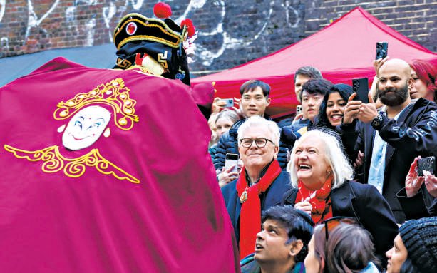 21日,川剧演员在英国伦敦卡姆登集市举行的中国春节庆典活动上与观众互动。